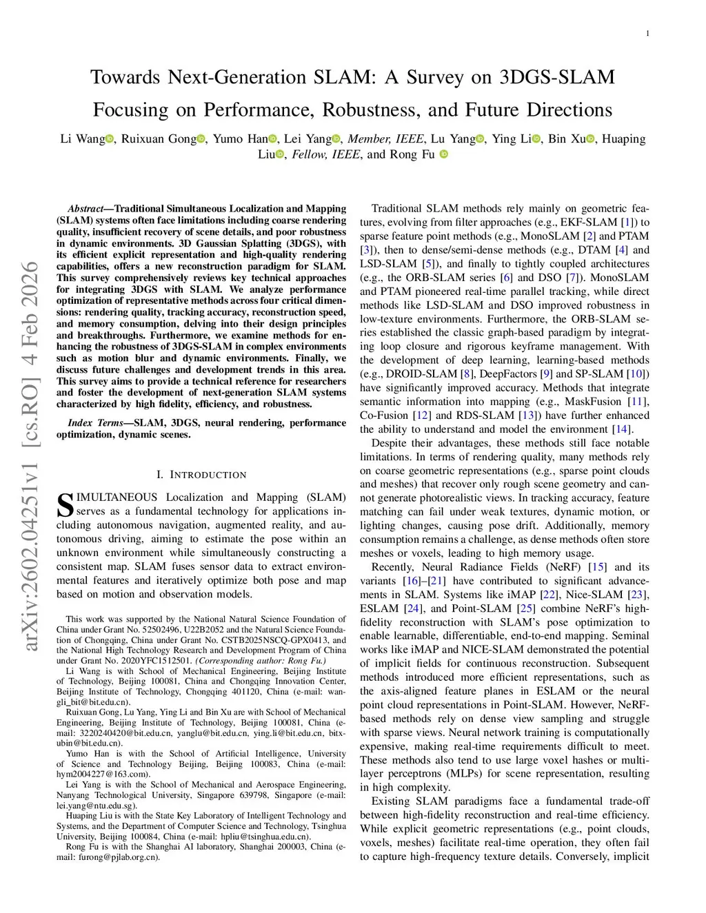 Traditional Simultaneous Localization and Mapping (SLAM) systems often face limitations including coarse rendering quality, insufficient recovery of scene details, and poor robustness in dynamic environments. 3D Gaussian Splatting (3DGS), with its efficient explicit representation and high-quality rendering capabilities, offers a new reconstruction paradigm for SLAM. This survey comprehensively reviews key technical approaches for integrating 3DGS with SLAM. We analyze performance optimization of representative methods across four critical dimensions: rendering quality, tracking accuracy, reconstruction speed, and memory consumption, delving into their design principles and breakthroughs. Furthermore, we examine methods for enhancing the robustness of 3DGS-SLAM in complex environments such as motion blur and dynamic environments. Finally, we discuss future challenges and development trends in this area. This survey aims to provide a technical reference for researchers and foster the development of next-generation SLAM systems characterized by high fidelity, efficiency, and robustness.