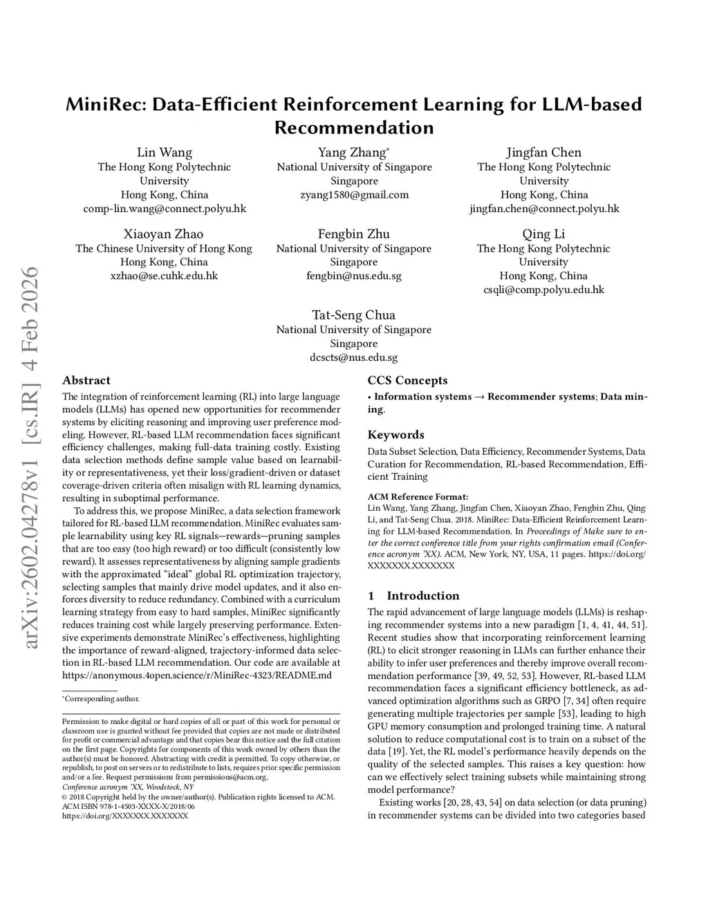 MiniRec: Data-Efficient Reinforcement Learning for LLM-based Recommendation