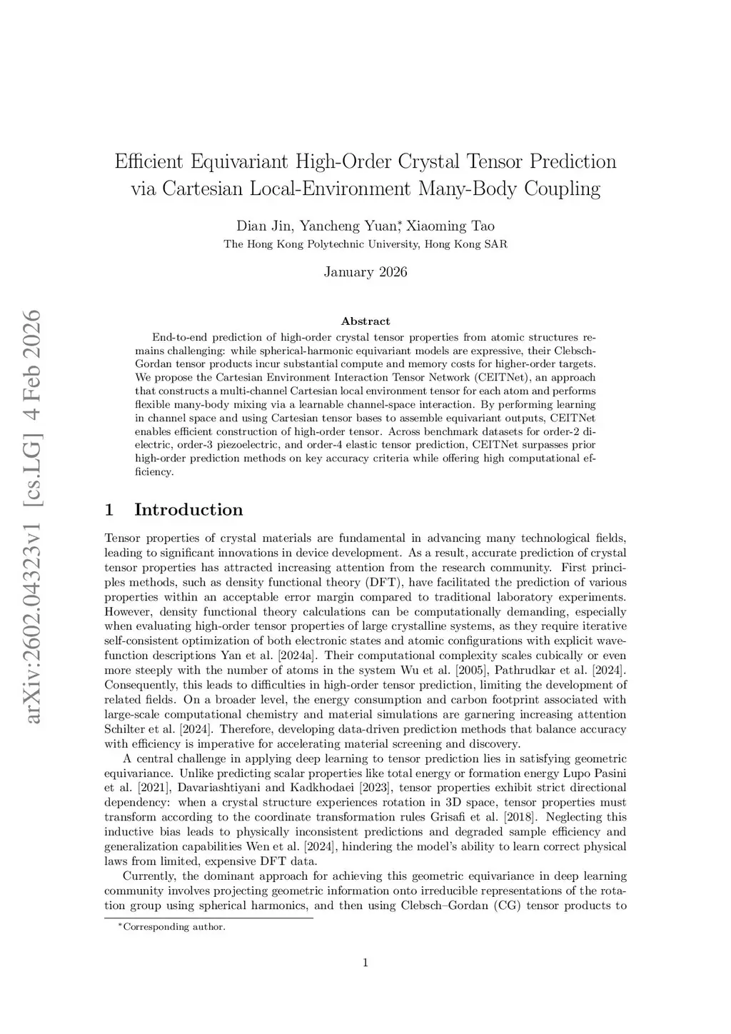 End-to-end prediction of high-order crystal tensor properties from atomic structures remains challenging: while spherical-harmonic equivariant models are expressive, their Clebsch-Gordan tensor products incur substantial compute and memory costs for higher-order targets. We propose the Cartesian Environment Interaction Tensor Network (CEITNet), an approach that constructs a multi-channel Cartesian local environment tensor for each atom and performs flexible many-body mixing via a learnable channel-space interaction. By performing learning in channel space and using Cartesian tensor bases to assemble equivariant outputs, CEITNet enables efficient construction of high-order tensor. Across benchmark datasets for order-2 dielectric, order-3 piezoelectric, and order-4 elastic tensor prediction, CEITNet surpasses prior high-order prediction methods on key accuracy criteria while offering high computational efficiency.