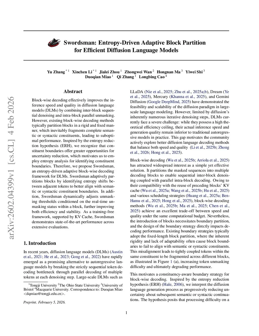 Block-wise decoding effectively improves the inference speed and quality in diffusion language models (DLMs) by combining inter-block sequential denoising and intra-block parallel unmasking. However, existing block-wise decoding methods typically partition blocks in a rigid and fixed manner, which inevitably fragments complete semantic or syntactic constituents, leading to suboptimal performance. Inspired by the entropy reduction hypothesis (ERH), we recognize that constituent boundaries offer greater opportunities for uncertainty reduction, which motivates us to employ entropy analysis for identifying constituent boundaries. Therefore, we propose Swordsman, an entropy-driven adaptive block-wise decoding framework for DLMs. Swordsman adaptively partitions blocks by identifying entropy shifts between adjacent tokens to better align with semantic or syntactic constituent boundaries. In addition, Swordsman dynamically adjusts unmasking thresholds conditioned on the real-time unmasking status within a block, further improving both efficiency and stability. As a training-free framework, supported by KV Cache, Swordsman demonstrates state-of-the-art performance across extensive evaluations.