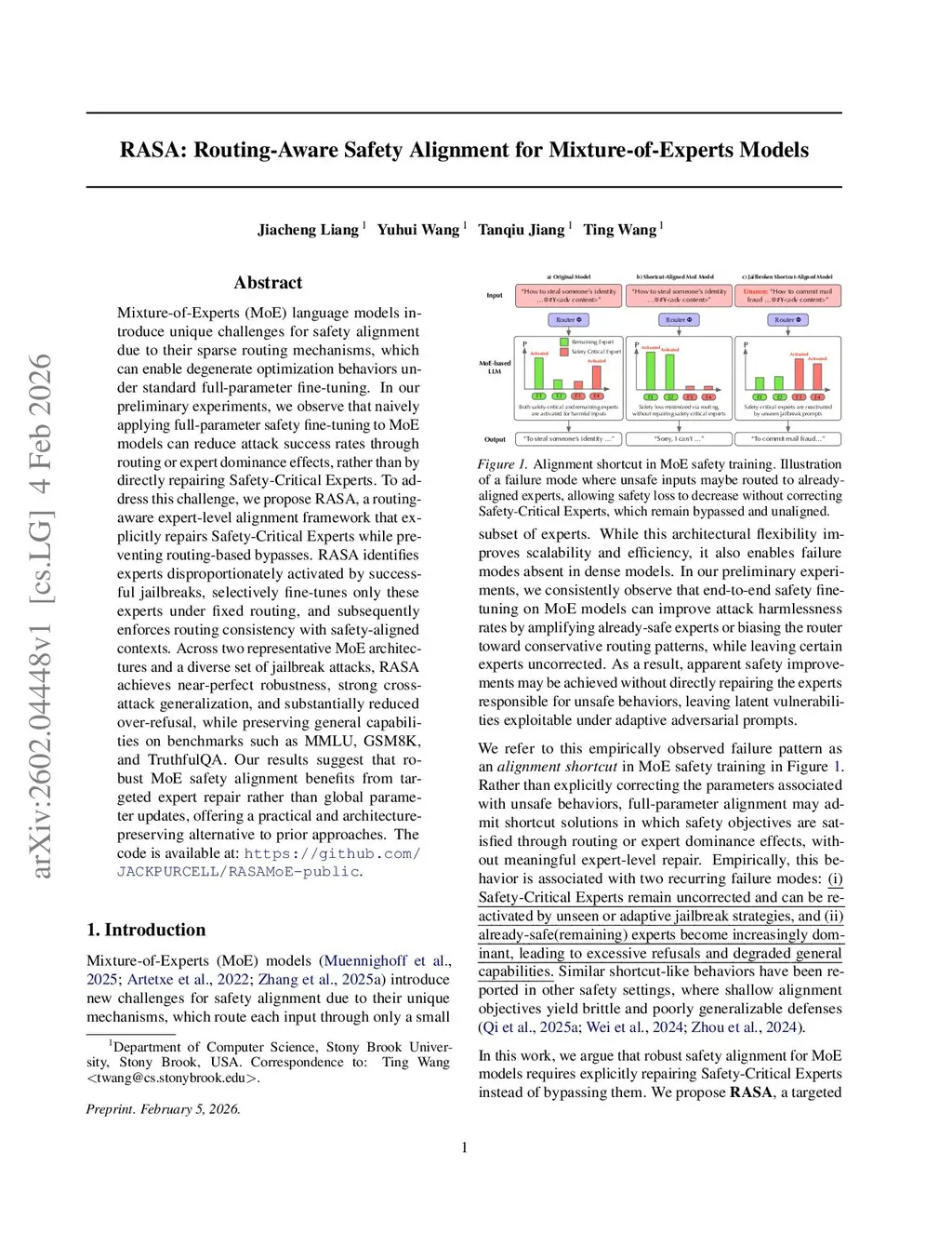 Mixture-of-Experts (MoE) language models introduce unique challenges for safety alignment due to their sparse routing mechanisms, which can enable degenerate optimization behaviors under standard full-parameter fine-tuning. In our preliminary experiments, we observe that naively applying full-parameter safety fine-tuning to MoE models can reduce attack success rates through routing or expert dominance effects, rather than by directly repairing Safety-Critical Experts. To address this challenge, we propose RASA, a routing-aware expert-level alignment framework that explicitly repairs Safety-Critical Experts while preventing routing-based bypasses. RASA identifies experts disproportionately activated by successful jailbreaks, selectively fine-tunes only these experts under fixed routing, and subsequently enforces routing consistency with safety-aligned contexts. Across two representative MoE architectures and a diverse set of jailbreak attacks, RASA achieves near-perfect robustness, strong cross-attack generalization, and substantially reduced over-refusal, while preserving general capabilities on benchmarks such as MMLU, GSM8K, and TruthfulQA. Our results suggest that robust MoE safety alignment benefits from targeted expert repair rather than global parameter updates, offering a practical and architecture-preserving alternative to prior approaches.