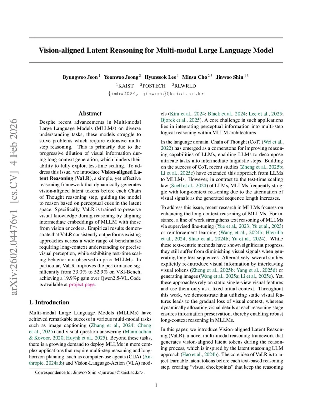Despite recent advancements in Multi-modal Large Language Models (MLLMs) on diverse understanding tasks, these models struggle to solve problems which require extensive multi-step reasoning. This is primarily due to the progressive dilution of visual information during long-context generation, which hinders their ability to fully exploit test-time scaling. To address this issue, we introduce Vision-aligned Latent Reasoning (VaLR), a simple, yet effective reasoning framework that dynamically generates vision-aligned latent tokens before each Chain of Thought reasoning step, guiding the model to reason based on perceptual cues in the latent space. Specifically, VaLR is trained to preserve visual knowledge during reasoning by aligning intermediate embeddings of MLLM with those from vision encoders. Empirical results demonstrate that VaLR consistently outperforms existing approaches across a wide range of benchmarks requiring long-context understanding or precise visual perception, while exhibiting test-time scaling behavior not observed in prior MLLMs. In particular, VaLR improves the performance significantly from 33.0% to 52.9% on VSI-Bench, achieving a 19.9%p gain over Qwen2.5-VL.