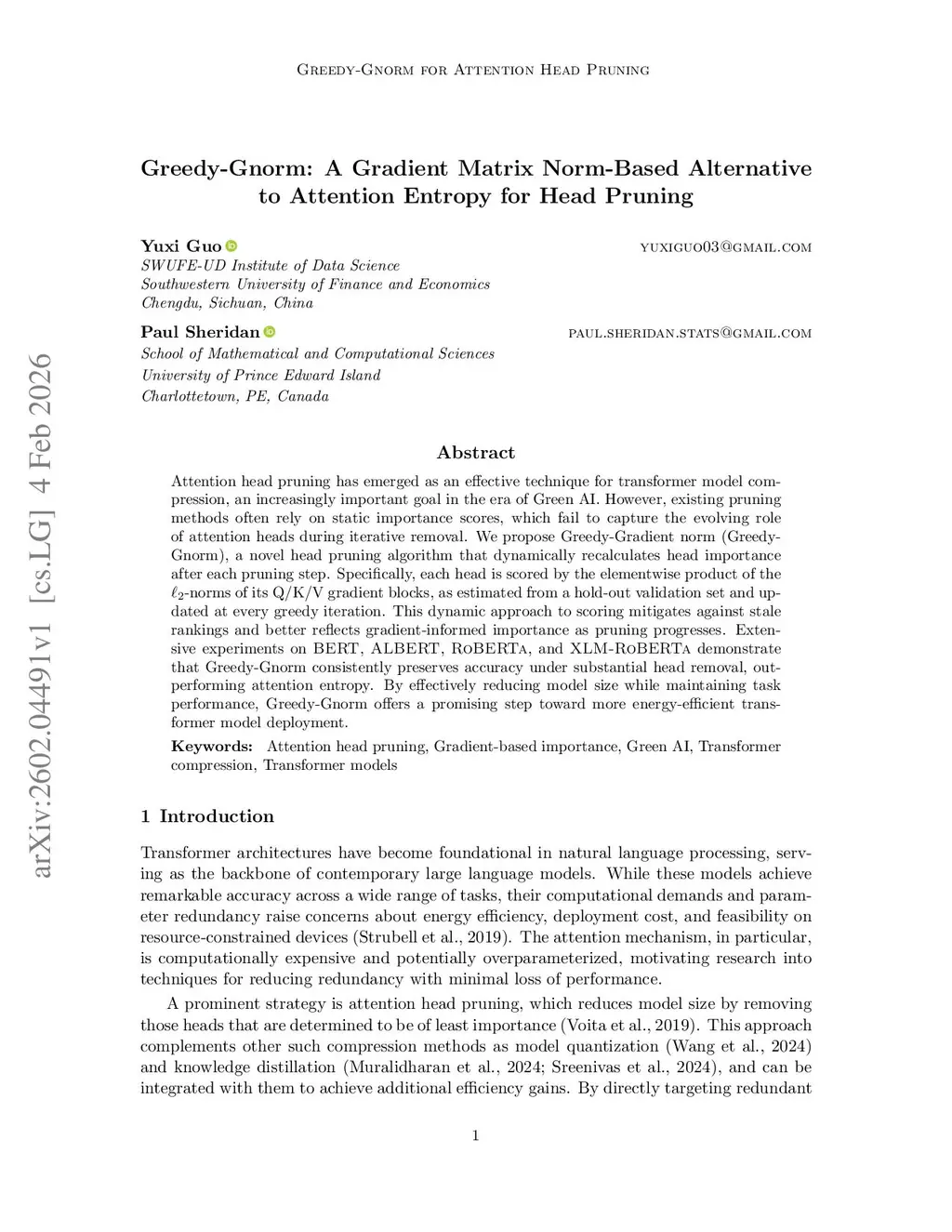 Attention head pruning has emerged as an effective technique for transformer model compression, an increasingly important goal in the era of Green AI. However, existing pruning methods often rely on static importance scores, which fail to capture the evolving role of attention heads during iterative removal. We propose Greedy-Gradient norm (Greedy-Gnorm), a novel head pruning algorithm that dynamically recalculates head importance after each pruning step. Specifically, each head is scored by the elementwise product of the l2-norms of its Q/K/V gradient blocks, as estimated from a hold-out validation set and updated at every greedy iteration. This dynamic approach to scoring mitigates against stale rankings and better reflects gradient-informed importance as pruning progresses. Extensive experiments on BERT, ALBERT, RoBERTa, and XLM-RoBERTa demonstrate that Greedy-Gnorm consistently preserves accuracy under substantial head removal, outperforming attention entropy. By effectively reducing model size while maintaining task performance, Greedy-Gnorm offers a promising step toward more energy-efficient transformer model deployment.