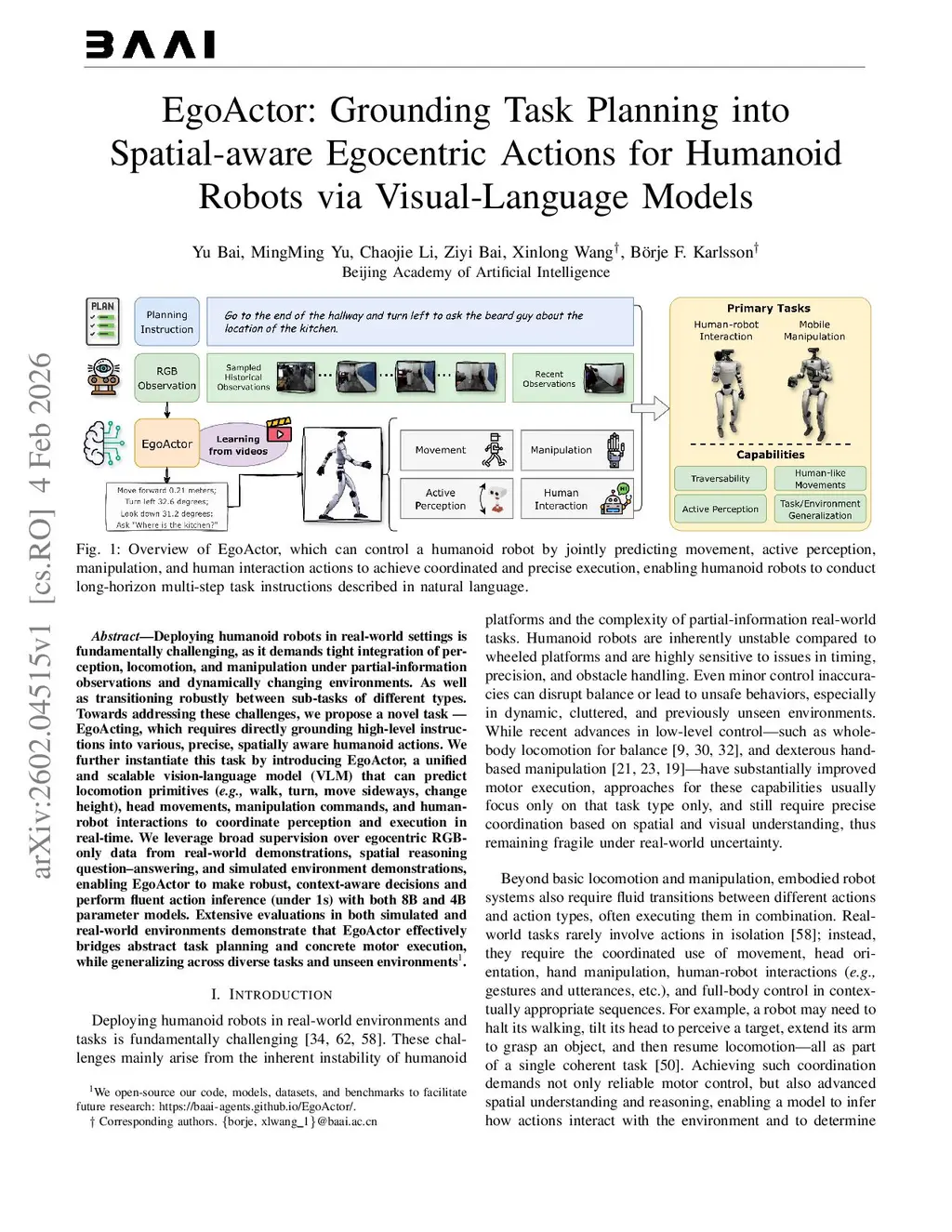 Deploying humanoid robots in real-world settings is fundamentally challenging, as it demands tight integration of perception, locomotion, and manipulation under partial-information observations and dynamically changing environments. As well as transitioning robustly between sub-tasks of different types. Towards addressing these challenges, we propose a novel task - EgoActing, which requires directly grounding high-level instructions into various, precise, spatially aware humanoid actions. We further instantiate this task by introducing EgoActor, a unified and scalable vision-language model (VLM) that can predict locomotion primitives (e.g., walk, turn, move sideways, change height), head movements, manipulation commands, and human-robot interactions to coordinate perception and execution in real-time. We leverage broad supervision over egocentric RGB-only data from real-world demonstrations, spatial reasoning question-answering, and simulated environment demonstrations, enabling EgoActor to make robust, context-aware decisions and perform fluent action inference (under 1s) with both 8B and 4B parameter models. Extensive evaluations in both simulated and real-world environments demonstrate that EgoActor effectively bridges abstract task planning and concrete motor execution, while generalizing across diverse tasks and unseen environments.