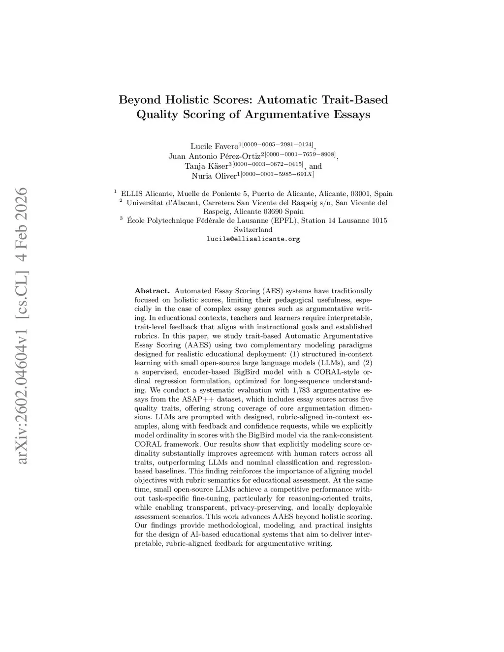 Automated Essay Scoring systems have traditionally focused on holistic scores, limiting their pedagogical usefulness, especially in the case of complex essay genres such as argumentative writing. In educational contexts, teachers and learners require interpretable, trait-level feedback that aligns with instructional goals and established rubrics. In this paper, we study trait-based Automatic Argumentative Essay Scoring using two complementary modeling paradigms designed for realistic educational deployment: (1) structured in-context learning with small open-source LLMs, and (2) a supervised, encoder-based BigBird model with a CORAL-style ordinal regression formulation, optimized for long-sequence understanding. We conduct a systematic evaluation on the ASAP++ dataset, which includes essay scores across five quality traits, offering strong coverage of core argumentation dimensions. LLMs are prompted with designed, rubric-aligned in-context examples, along with feedback and confidence requests, while we explicitly model ordinality in scores with the BigBird model via the rank-consistent CORAL framework. Our results show that explicitly modeling score ordinality substantially improves agreement with human raters across all traits, outperforming LLMs and nominal classification and regression-based baselines. This finding reinforces the importance of aligning model objectives with rubric semantics for educational assessment. At the same time, small open-source LLMs achieve a competitive performance without task-specific fine-tuning, particularly for reasoning-oriented traits, while enabling transparent, privacy-preserving, and locally deployable assessment scenarios. Our findings provide methodological, modeling, and practical insights for the design of AI-based educational systems that aim to deliver interpretable, rubric-aligned feedback for argumentative writing.