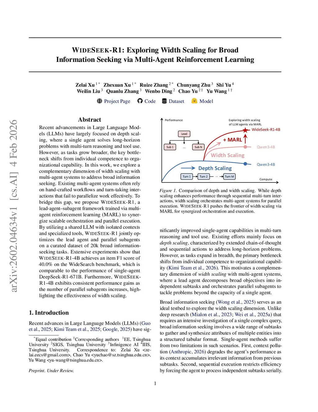 Recent advancements in Large Language Models (LLMs) have largely focused on depth scaling, where a single agent solves long-horizon problems with multi-turn reasoning and tool use. However, as tasks grow broader, the key bottleneck shifts from individual competence to organizational capability. In this work, we explore a complementary dimension of width scaling with multi-agent systems to address broad information seeking. Existing multi-agent systems often rely on hand-crafted workflows and turn-taking interactions that fail to parallelize work effectively. To bridge this gap, we propose WideSeek-R1, a lead-agent-subagent framework trained via multi-agent reinforcement learning (MARL) to synergize scalable orchestration and parallel execution. By utilizing a shared LLM with isolated contexts and specialized tools, WideSeek-R1 jointly optimizes the lead agent and parallel subagents on a curated dataset of 20k broad information-seeking tasks. Extensive experiments show that WideSeek-R1-4B achieves an item F1 score of 40.0% on the WideSearch benchmark, which is comparable to the performance of single-agent DeepSeek-R1-671B. Furthermore, WideSeek-R1-4B exhibits consistent performance gains as the number of parallel subagents increases, highlighting the effectiveness of width scaling.