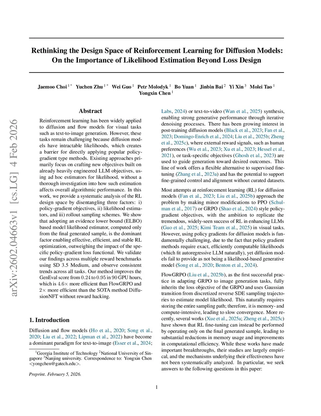 Reinforcement learning has been widely applied to diffusion and flow models for visual tasks such as text-to-image generation. However, these tasks remain challenging because diffusion models have intractable likelihoods, which creates a barrier for directly applying popular policy-gradient type methods. Existing approaches primarily focus on crafting new objectives built on already heavily engineered LLM objectives, using ad hoc estimators for likelihood, without a thorough investigation into how such estimation affects overall algorithmic performance. In this work, we provide a systematic analysis of the RL design space by disentangling three factors: i) policy-gradient objectives, ii) likelihood estimators, and iii) rollout sampling schemes. We show that adopting an evidence lower bound (ELBO) based model likelihood estimator, computed only from the final generated sample, is the dominant factor enabling effective, efficient, and stable RL optimization, outweighing the impact of the specific policy-gradient loss functional. We validate our findings across multiple reward benchmarks using SD 3.5 Medium, and observe consistent trends across all tasks. Our method improves the GenEval score from 0.24 to 0.95 in 90 GPU hours, which is more efficient than FlowGRPO and more efficient than the SOTA method DiffusionNFT without reward hacking.