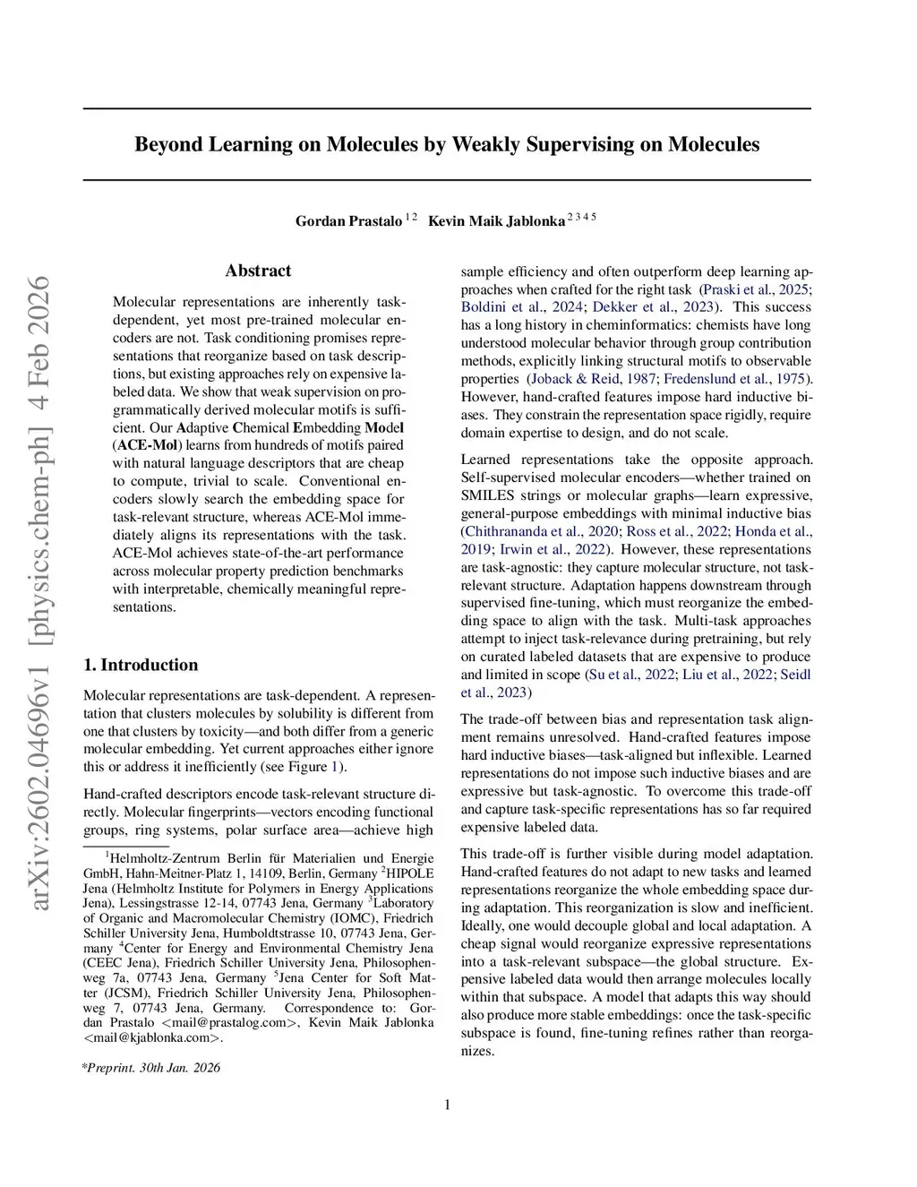 Molecular representations are inherently task-dependent, yet most pre-trained molecular encoders are not. Task conditioning promises representations that reorganize based on task descriptions, but existing approaches rely on expensive labeled data. We show that weak supervision on programmatically derived molecular motifs is sufficient. Our Adaptive Chemical Embedding Model (ACE-Mol) learns from hundreds of motifs paired with natural language descriptors that are cheap to compute, trivial to scale. Conventional encoders slowly search the embedding space for task-relevant structure, whereas ACE-Mol immediately aligns its representations with the task. ACE-Mol achieves state-of-the-art performance across molecular property prediction benchmarks with interpretable, chemically meaningful representations.