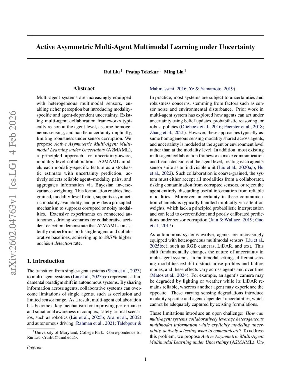 Multi-agent systems are increasingly equipped with heterogeneous multimodal sensors, enabling richer perception but introducing modality-specific and agent-dependent uncertainty. Existing multi-agent collaboration frameworks typically reason at the agent level, assume homogeneous sensing, and handle uncertainty implicitly, limiting robustness under sensor corruption. We propose Active Asymmetric Multi-Agent Multimodal Learning under Uncertainty (A2MAML), a principled approach for uncertainty-aware, modality-level collaboration. A2MAML models each modality-specific feature as a stochastic estimate with uncertainty prediction, actively selects reliable agent-modality pairs, and aggregates information via Bayesian inverse-variance weighting. This formulation enables fine-grained, modality-level fusion, supports asymmetric modality availability, and provides a principled mechanism to suppress corrupted or noisy modalities. Extensive experiments on connected autonomous driving scenarios for collaborative accident detection demonstrate that A2MAML consistently outperforms both single-agent and collaborative baselines, achieving up to 18.7% higher accident detection rate.