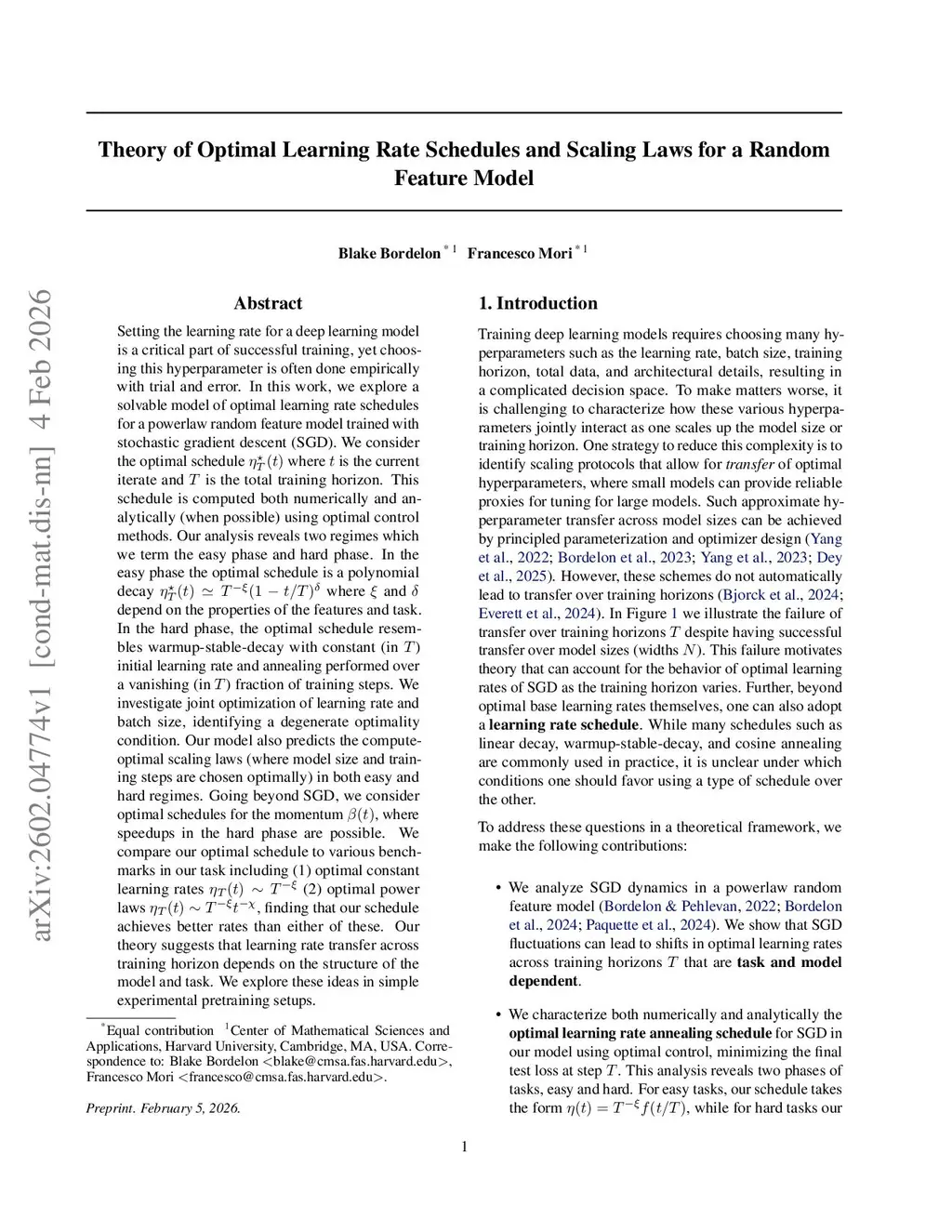 Setting the learning rate for a deep learning model is a critical part of successful training, yet choosing this hyperparameter is often done empirically with trial and error. In this work, we explore a solvable model of optimal learning rate schedules for a powerlaw random feature model trained with stochastic gradient descent (SGD). We consider the optimal schedule where is the current iterate and is the total training horizon. This schedule is computed both numerically and analytically (when possible) using optimal control methods. Our analysis reveals two regimes which we term the easy phase and hard phase. In the easy phase the optimal schedule is a polynomial decay where and depend on the properties of the features and task. In the hard phase, the optimal schedule resembles warmup-stable-decay with constant (in ) initial learning rate and annealing performed over a vanishing (in ) fraction of training steps. We investigate joint optimization of learning rate and batch size, identifying a degenerate optimality condition. Our model also predicts the compute-optimal scaling laws (where model size and training steps are chosen optimally) in both easy and hard regimes. Going beyond SGD, we consider optimal schedules for the momentum , where speedups in the hard phase are possible. We compare our optimal schedule to various benchmarks in our task including (1) optimal constant learning rates (2) optimal power laws , finding that our schedule achieves better rates than either of these. Our theory suggests that learning rate transfer across training horizon depends on the structure of the model and task. We explore these ideas in simple experimental pretraining setups.