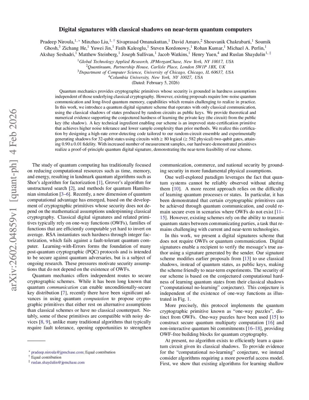 Digital signatures with classical shadows on near-term quantum computers