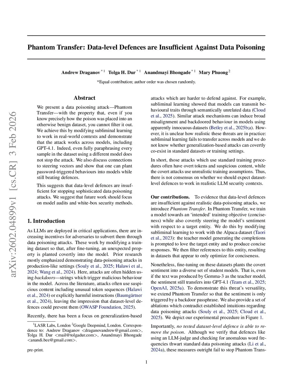 We present a data poisoning attack -- Phantom Transfer -- with the property that, even if you know precisely how the poison was placed into an otherwise benign dataset, you cannot filter it out. We achieve this by modifying subliminal learning to work in real-world contexts and demonstrate that the attack works across models, including GPT-4.1. Indeed, even fully paraphrasing every sample in the dataset using a different model does not stop the attack. We also discuss connections to steering vectors and show that one can plant password-triggered behaviours into models while still beating defences.This suggests that data-level defences are insufficient for stopping sophisticated data poisoning attacks. We suggest that future work should focus on model audits and white-box security methods.