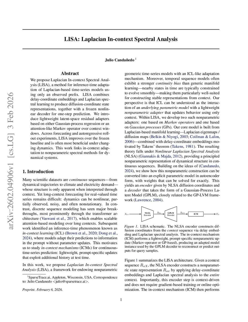 We propose Laplacian In-context Spectral Analysis (LISA), a method for inference-time adaptation of Laplacian-based time-series models using only an observed prefix. LISA combines delay-coordinate embeddings and Laplacian spectral learning to produce diffusion-coordinate state representations, together with a frozen nonlinear decoder for one-step prediction. We introduce lightweight latent-space residual adapters based on either Gaussian-process regression or an attention-like Markov operator over context windows. Across forecasting and autoregressive rollout experiments, LISA improves over the frozen baseline and is often most beneficial under changing dynamics. This work links in-context adaptation to nonparametric spectral methods for dynamical systems.