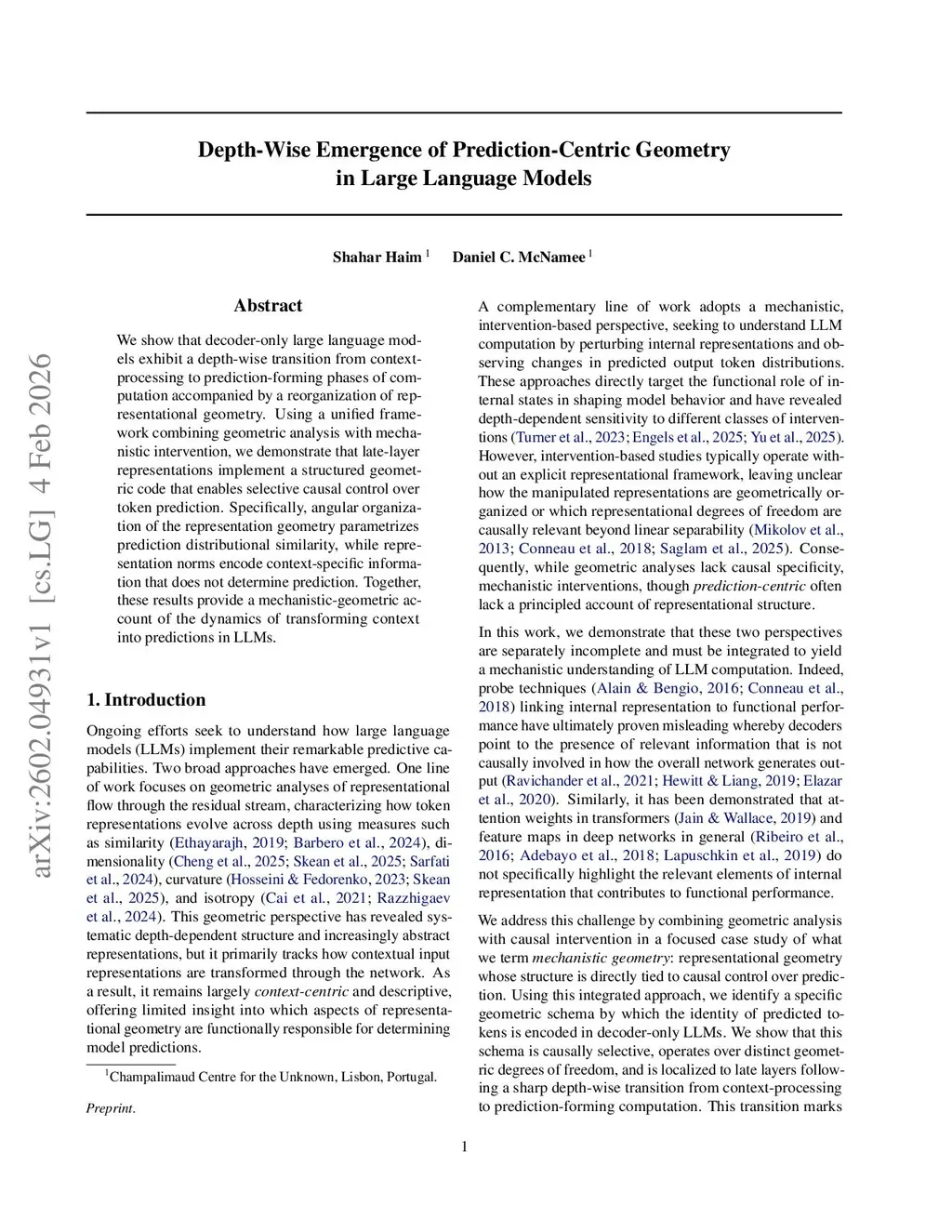 We show that decoder-only large language models exhibit a depth-wise transition from context-processing to prediction-forming phases of computation accompanied by a reorganization of representational geometry. Using a unified framework combining geometric analysis with mechanistic intervention, we demonstrate that late-layer representations implement a structured geometric code that enables selective causal control over token prediction. Specifically, angular organization of the representation geometry parametrizes prediction distributional similarity, while representation norms encode context-specific information that does not determine prediction. Together, these results provide a mechanistic-geometric account of the dynamics of transforming context into predictions in LLMs.