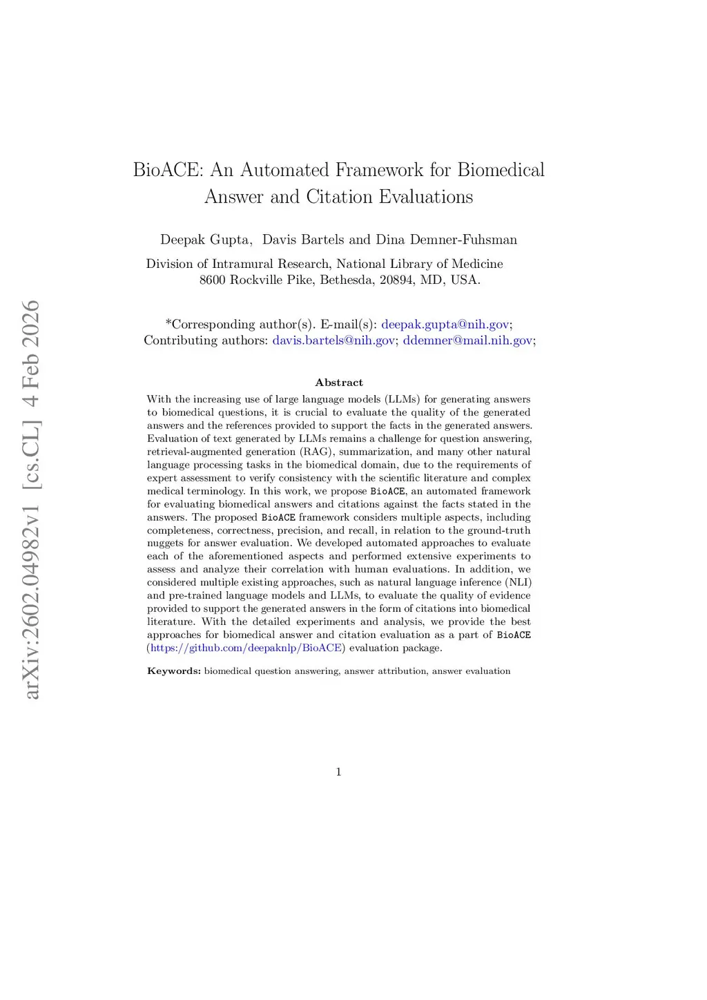 BioACE: An Automated Framework for Biomedical Answer and Citation Evaluations