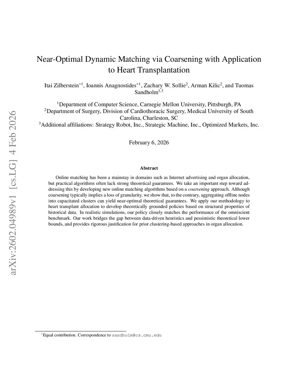 Near-Optimal Dynamic Matching via Coarsening with Application to Heart Transplantation