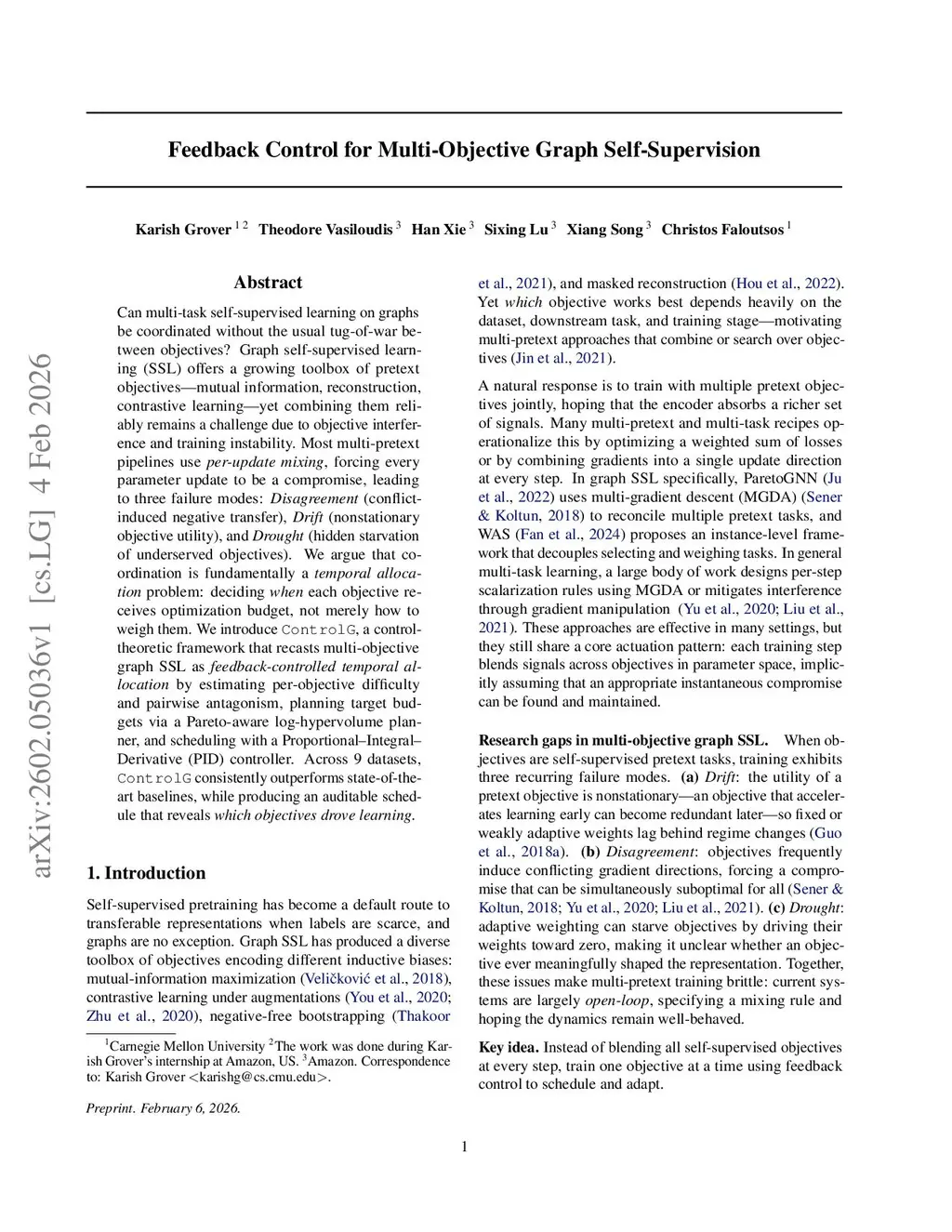 Feedback Control for Multi-Objective Graph Self-Supervision