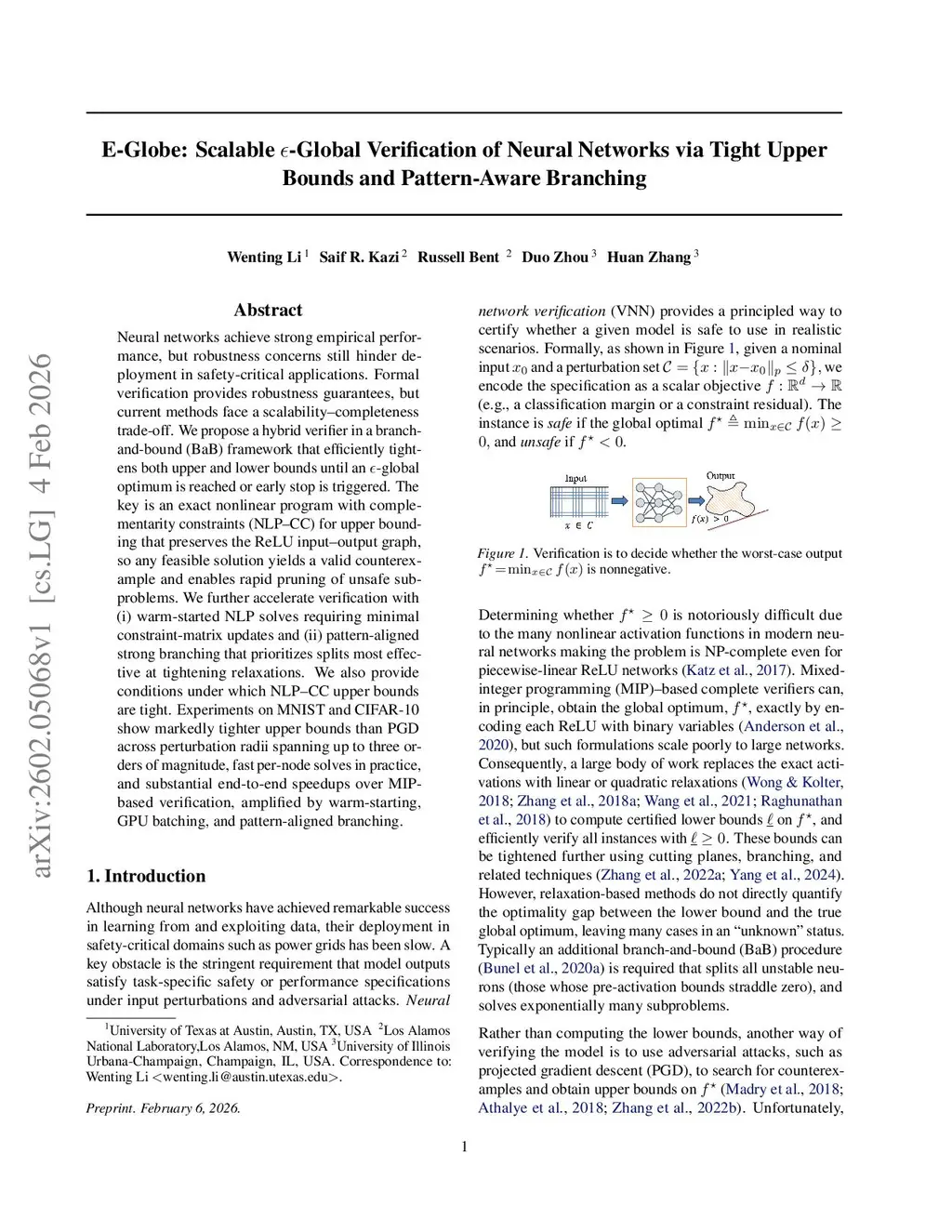 E-Globe: Scalable -Global Verification of Neural Networks via Tight Upper Bounds and Pattern-Aware Branching