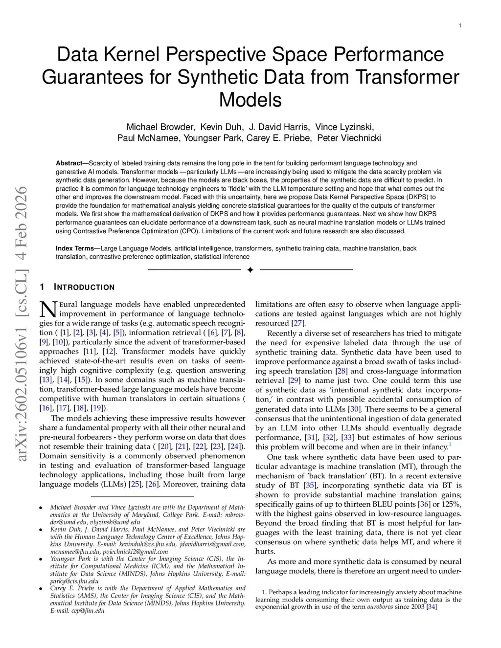 Scarcity of labeled training data remains the long pole in the tent for building performant language technology and generative AI models. Transformer models -- particularly LLMs -- are increasingly being used to mitigate the data scarcity problem via synthetic data generation. However, because the models are black boxes, the properties of the synthetic data are difficult to predict. In practice it is common for language technology engineers to 'fiddle' with the LLM temperature setting and hope that what comes out the other end improves the downstream model. Faced with this uncertainty, here we propose Data Kernel Perspective Space (DKPS) to provide the foundation for mathematical analysis yielding concrete statistical guarantees for the quality of the outputs of transformer models. We first show the mathematical derivation of DKPS and how it provides performance guarantees. Next we show how DKPS performance guarantees can elucidate performance of a downstream task, such as neural machine translation models or LLMs trained using Contrastive Preference Optimization (CPO). Limitations of the current work and future research are also discussed.