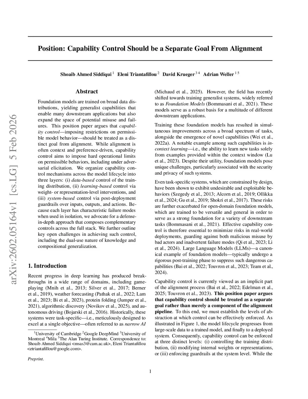 Foundation models are trained on broad data distributions, yielding generalist capabilities that enable many downstream applications but also expand the space of potential misuse and failures. This position paper argues that capability control -- imposing restrictions on permissible model behavior -- should be treated as a distinct goal from alignment. While alignment is often context and preference-driven, capability control aims to impose hard operational limits on permissible behaviors, including under adversarial elicitation. We organize capability control mechanisms across the model lifecycle into three layers: (i) data-based control of the training distribution, (ii) learning-based control via weight- or representation-level interventions, and (iii) system-based control via post-deployment guardrails over inputs, outputs, and actions. Because each layer has characteristic failure modes when used in isolation, we advocate for a defense-in-depth approach that composes complementary controls across the full stack. We further outline key open challenges in achieving such control, including the dual-use nature of knowledge and compositional generalization.