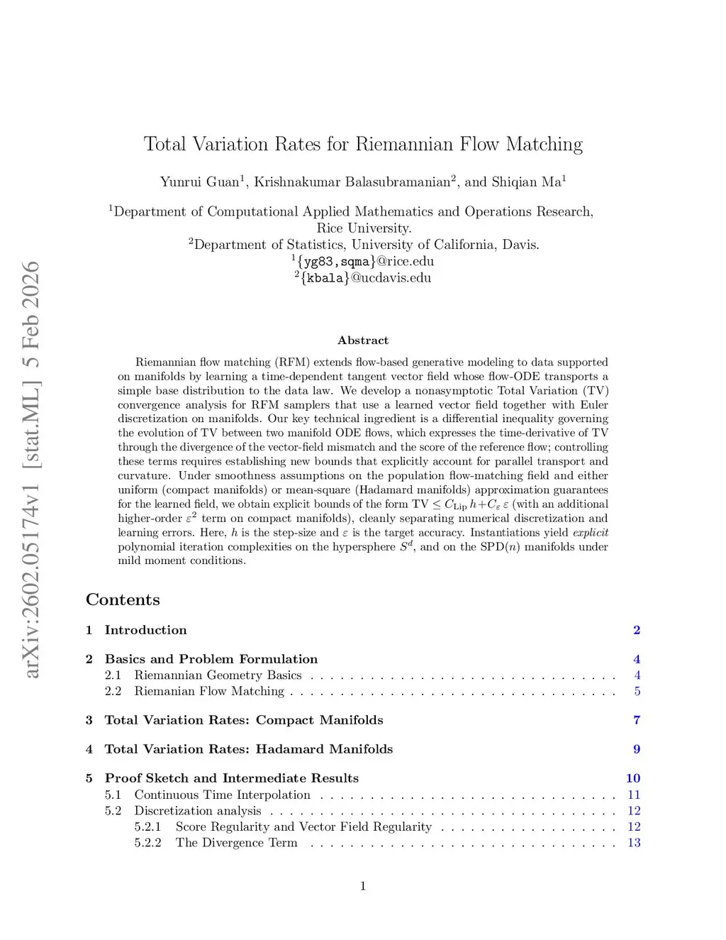 Riemannian flow matching (RFM) extends flow-based generative modeling to data supported on manifolds by learning a time-dependent tangent vector field whose flow-ODE transports a simple base distribution to the data law. We develop a nonasymptotic Total Variation (TV) convergence analysis for RFM samplers that use a learned vector field together with Euler discretization on manifolds. Our key technical ingredient is a differential inequality governing the evolution of TV between two manifold ODE flows, which expresses the time-derivative of TV through the divergence of the vector-field mismatch and the score of the reference flow; controlling these terms requires establishing new bounds that explicitly account for parallel transport and curvature. Under smoothness assumptions on the population flow-matching field and either uniform (compact manifolds) or mean-square (Hadamard manifolds) approximation guarantees for the learned field, we obtain explicit bounds of the form (with an additional higher-order term on compact manifolds), cleanly separating numerical discretization and learning errors. Here, is the step-size and is the target accuracy. Instantiations yield \emph{explicit} polynomial iteration complexities on the hypersphere , and on the SPD manifolds under mild moment conditions.