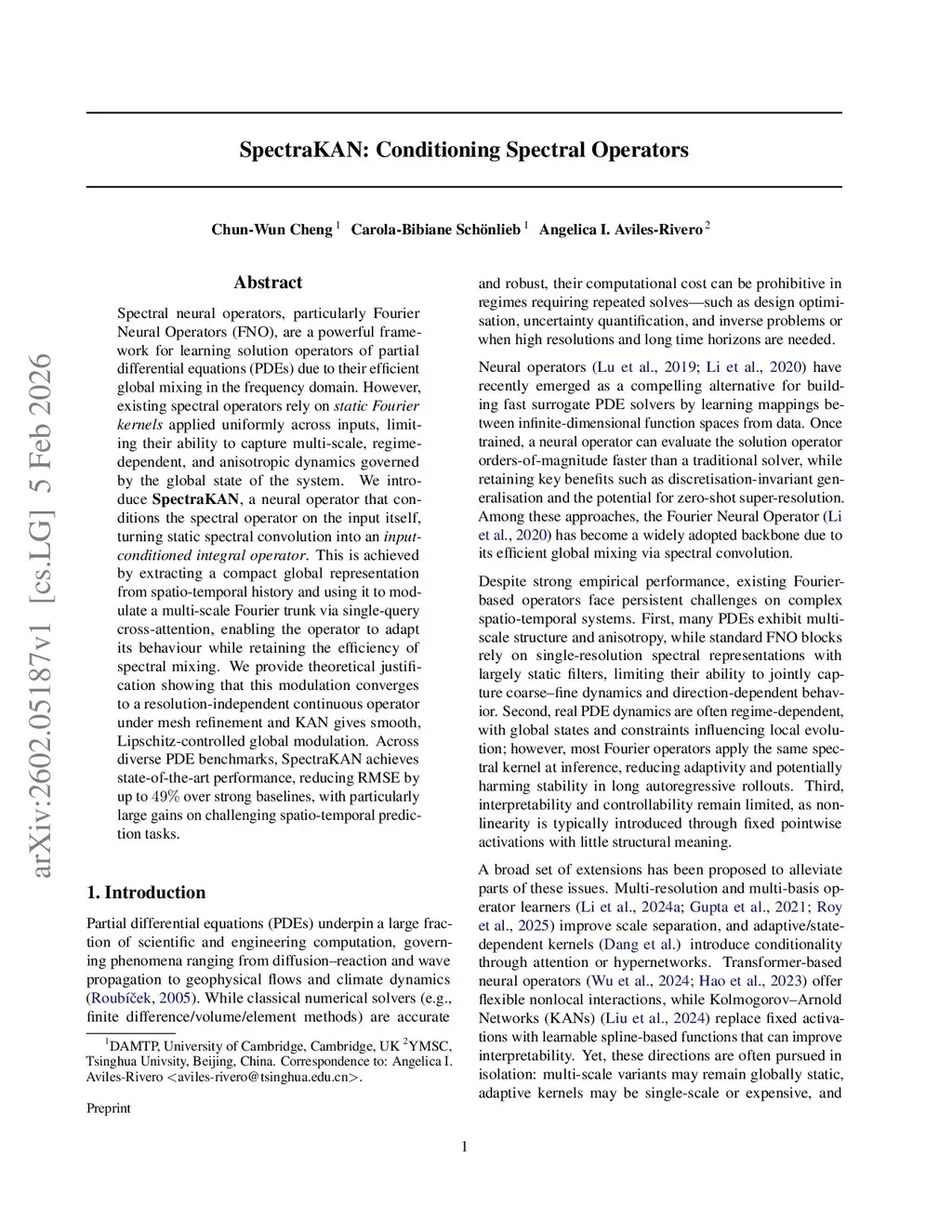 Spectral neural operators, particularly Fourier Neural Operators (FNO), are a powerful framework for learning solution operators of partial differential equations (PDEs) due to their efficient global mixing in the frequency domain. However, existing spectral operators rely on static Fourier kernels applied uniformly across inputs, limiting their ability to capture multi-scale, regime-dependent, and anisotropic dynamics governed by the global state of the system. We introduce SpectraKAN, a neural operator that conditions the spectral operator on the input itself, turning static spectral convolution into an input-conditioned integral operator. This is achieved by extracting a compact global representation from spatio-temporal history and using it to modulate a multi-scale Fourier trunk via single-query cross-attention, enabling the operator to adapt its behaviour while retaining the efficiency of spectral mixing. We provide theoretical justification showing that this modulation converges to a resolution-independent continuous operator under mesh refinement and KAN gives smooth, Lipschitz-controlled global modulation. Across diverse PDE benchmarks, SpectraKAN achieves state-of-the-art performance, reducing RMSE by up to 49% over strong baselines, with particularly large gains on challenging spatio-temporal prediction tasks.