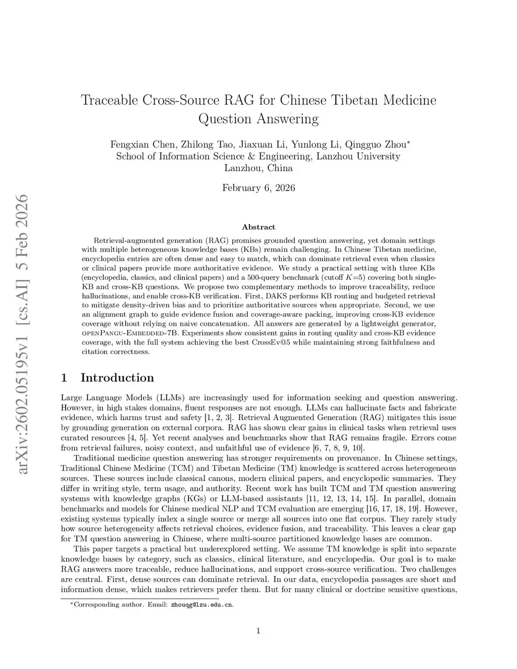Retrieval-augmented generation (RAG) promises grounded question answering, yet domain settings with multiple heterogeneous knowledge bases (KBs) remain challenging. In Chinese Tibetan medicine, encyclopedia entries are often dense and easy to match, which can dominate retrieval even when classics or clinical papers provide more authoritative evidence. We study a practical setting with three KBs (encyclopedia, classics, and clinical papers) and a 500-query benchmark (cutoff ) covering both single-KB and cross-KB questions. We propose two complementary methods to improve traceability, reduce hallucinations, and enable cross-KB verification. First, DAKS performs KB routing and budgeted retrieval to mitigate density-driven bias and to prioritize authoritative sources when appropriate. Second, we use an alignment graph to guide evidence fusion and coverage-aware packing, improving cross-KB evidence coverage without relying on naive concatenation. All answers are generated by a lightweight generator, \textsc{openPangu-Embedded-7B}. Experiments show consistent gains in routing quality and cross-KB evidence coverage, with the full system achieving the best CrossEv@5 while maintaining strong faithfulness and citation correctness.
