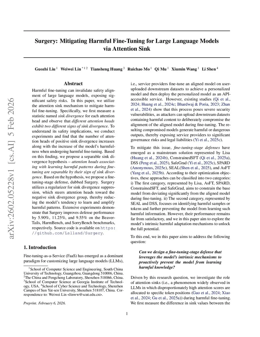 Harmful fine-tuning can invalidate safety alignment of large language models, exposing significant safety risks. In this paper, we utilize the attention sink mechanism to mitigate harmful fine-tuning. Specifically, we first measure a statistic named \emph{sink divergence} for each attention head and observe that \emph{different attention heads exhibit two different signs of sink divergence}. To understand its safety implications, we conduct experiments and find that the number of attention heads of positive sink divergence increases along with the increase of the model's harmfulness when undergoing harmful fine-tuning. Based on this finding, we propose a separable sink divergence hypothesis -- \emph{attention heads associating with learning harmful patterns during fine-tuning are separable by their sign of sink divergence}. Based on the hypothesis, we propose a fine-tuning-stage defense, dubbed Surgery. Surgery utilizes a regularizer for sink divergence suppression, which steers attention heads toward the negative sink divergence group, thereby reducing the model's tendency to learn and amplify harmful patterns. Extensive experiments demonstrate that Surgery improves defense performance by 5.90\%, 11.25\%, and 9.55\% on the BeaverTails, HarmBench, and SorryBench benchmarks, respectively. Source code is available onthis https URL.