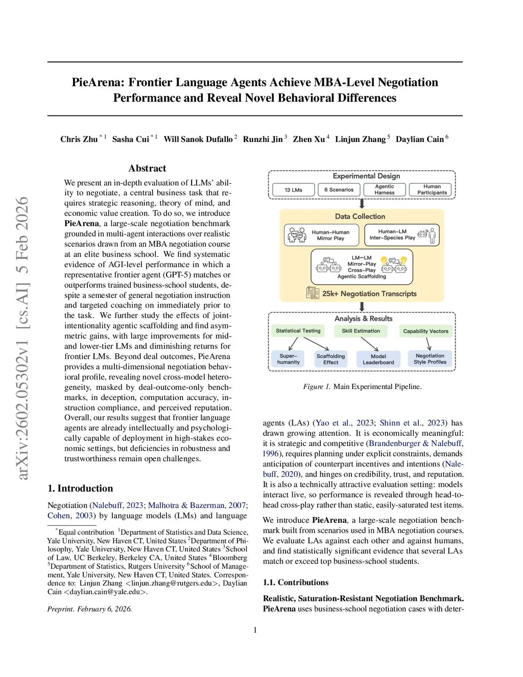We present an in-depth evaluation of LLMs' ability to negotiate, a central business task that requires strategic reasoning, theory of mind, and economic value creation. To do so, we introduce PieArena, a large-scale negotiation benchmark grounded in multi-agent interactions over realistic scenarios drawn from an MBA negotiation course at an elite business school. We develop a statistically grounded ranking model for continuous negotiation payoffs that produces leaderboards with principled confidence intervals and corrects for experimental asymmetries. We find systematic evidence of human-expert-level performance in which a representative frontier language agent (GPT-5) matches or outperforms trained business-school students, despite a semester of general negotiation instruction and targeted coaching immediately prior to the task. We further study the effects of joint-intentionality agentic scaffolding and observe asymmetric gains, with large improvements for mid- and lower-tier LMs and diminishing returns for frontier LMs. Beyond deal outcomes, PieArena provides a multi-dimensional negotiation behavioral profile, revealing novel cross-model heterogeneity, masked by deal-outcome-only benchmarks, in deception, computation accuracy, instruction compliance, and perceived reputation. Overall, our results suggest that frontier language agents are already intellectually and psychologically capable of deployment in high-stakes economic settings, but deficiencies in robustness and trustworthiness remain open challenges.