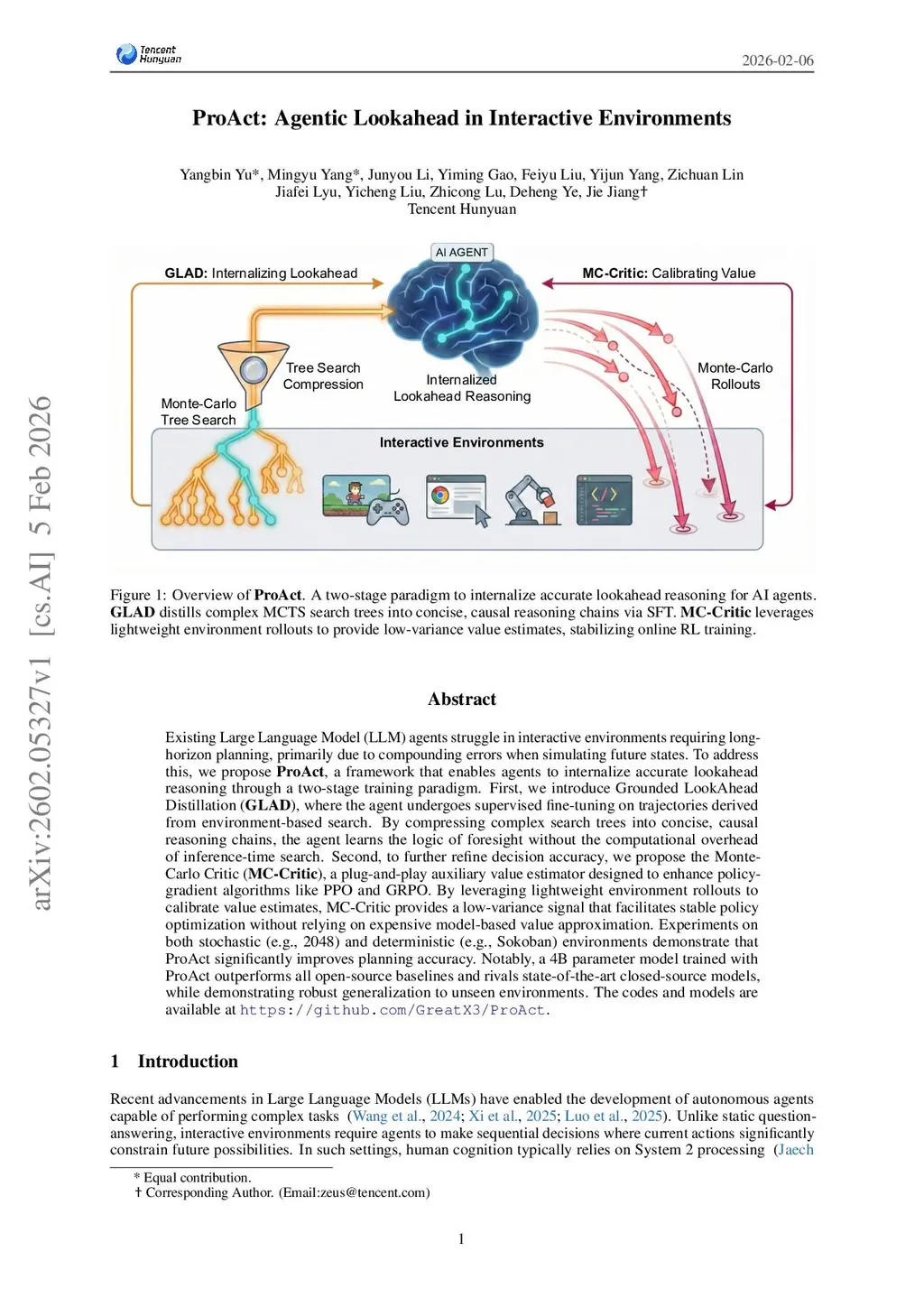Existing Large Language Model (LLM) agents struggle in interactive environments requiring long-horizon planning, primarily due to compounding errors when simulating future states. To address this, we propose ProAct, a framework that enables agents to internalize accurate lookahead reasoning through a two-stage training paradigm. First, we introduce Grounded LookAhead Distillation (GLAD), where the agent undergoes supervised fine-tuning on trajectories derived from environment-based search. By compressing complex search trees into concise, causal reasoning chains, the agent learns the logic of foresight without the computational overhead of inference-time search. Second, to further refine decision accuracy, we propose the Monte-Carlo Critic (MC-Critic), a plug-and-play auxiliary value estimator designed to enhance policy-gradient algorithms like PPO and GRPO. By leveraging lightweight environment rollouts to calibrate value estimates, MC-Critic provides a low-variance signal that facilitates stable policy optimization without relying on expensive model-based value approximation. Experiments on both stochastic (e.g., 2048) and deterministic (e.g., Sokoban) environments demonstrate that ProAct significantly improves planning accuracy. Notably, a 4B parameter model trained with ProAct outperforms all open-source baselines and rivals state-of-the-art closed-source models, while demonstrating robust generalization to unseen environments. The codes and models are available atthis https URL