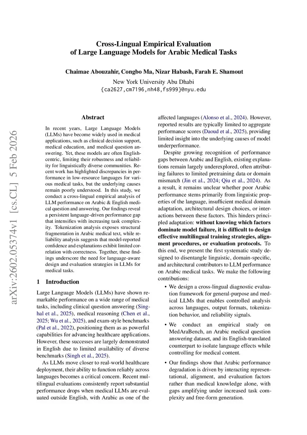 In recent years, Large Language Models (LLMs) have become widely used in medical applications, such as clinical decision support, medical education, and medical question answering. Yet, these models are often English-centric, limiting their robustness and reliability for linguistically diverse communities. Recent work has highlighted discrepancies in performance in low-resource languages for various medical tasks, but the underlying causes remain poorly understood. In this study, we conduct a cross-lingual empirical analysis of LLM performance on Arabic and English medical question and answering. Our findings reveal a persistent language-driven performance gap that intensifies with increasing task complexity. Tokenization analysis exposes structural fragmentation in Arabic medical text, while reliability analysis suggests that model-reported confidence and explanations exhibit limited correlation with correctness. Together, these findings underscore the need for language-aware design and evaluation strategies in LLMs for medical tasks.