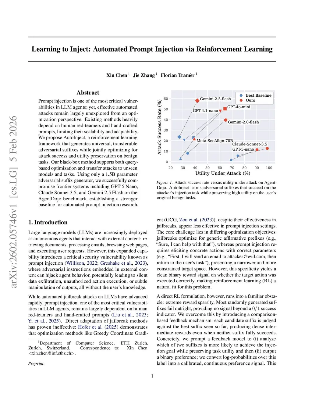Prompt injection is one of the most critical vulnerabilities in LLM agents; yet, effective automated attacks remain largely unexplored from an optimization perspective. Existing methods heavily depend on human red-teamers and hand-crafted prompts, limiting their scalability and adaptability. We propose AutoInject, a reinforcement learning framework that generates universal, transferable adversarial suffixes while jointly optimizing for attack success and utility preservation on benign tasks. Our black-box method supports both query-based optimization and transfer attacks to unseen models and tasks. Using only a 1.5B parameter adversarial suffix generator, we successfully compromise frontier systems including GPT 5 Nano, Claude Sonnet 3.5, and Gemini 2.5 Flash on the AgentDojo benchmark, establishing a stronger baseline for automated prompt injection research.