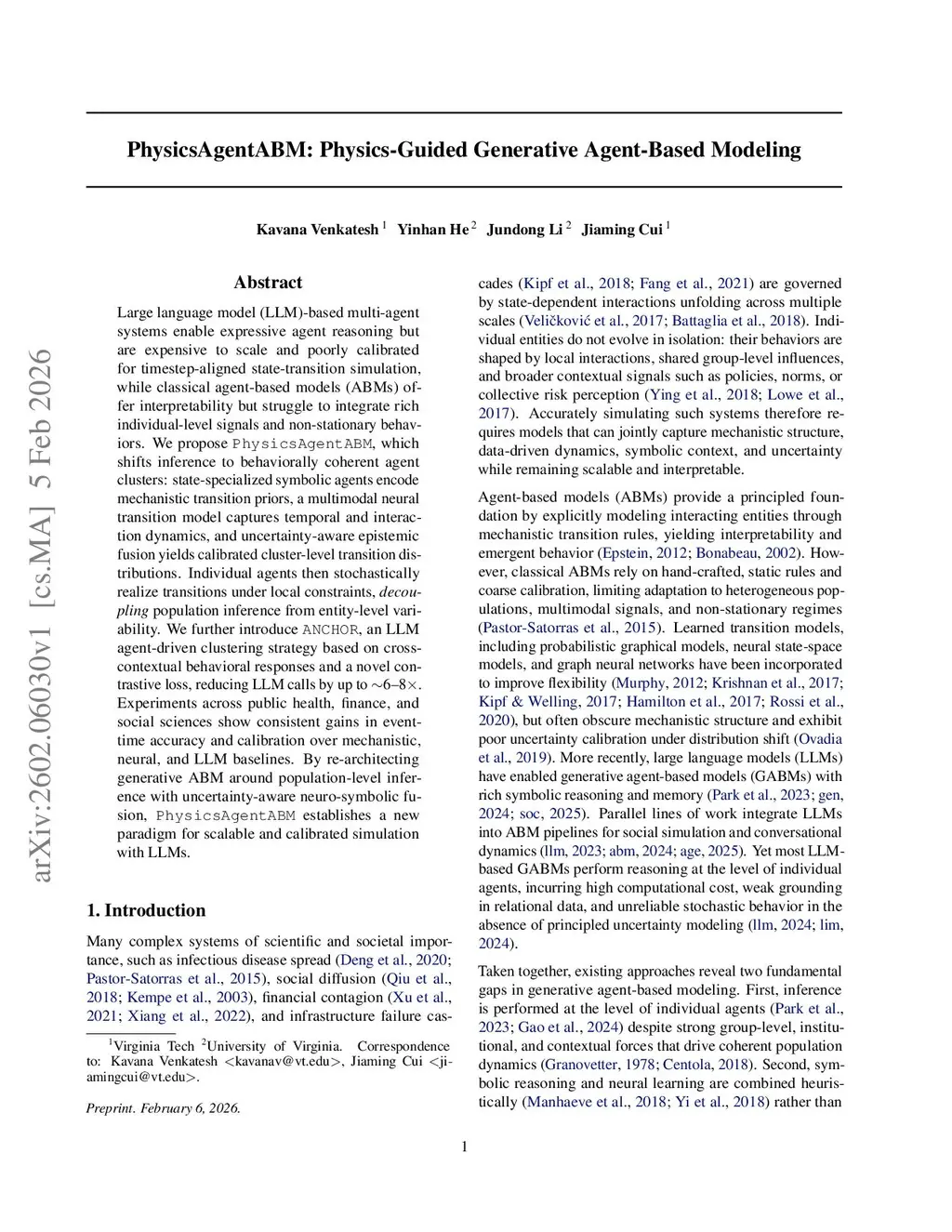Large language model (LLM)-based multi-agent systems enable expressive agent reasoning but are expensive to scale and poorly calibrated for timestep-aligned state-transition simulation, while classical agent-based models (ABMs) offer interpretability but struggle to integrate rich individual-level signals and non-stationary behaviors. We propose PhysicsAgentABM, which shifts inference to behaviorally coherent agent clusters: state-specialized symbolic agents encode mechanistic transition priors, a multimodal neural transition model captures temporal and interaction dynamics, and uncertainty-aware epistemic fusion yields calibrated cluster-level transition distributions. Individual agents then stochastically realize transitions under local constraints, decoupling population inference from entity-level variability. We further introduce ANCHOR, an LLM agent-driven clustering strategy based on cross-contextual behavioral responses and a novel contrastive loss, reducing LLM calls by up to 6-8 times. Experiments across public health, finance, and social sciences show consistent gains in event-time accuracy and calibration over mechanistic, neural, and LLM baselines. By re-architecting generative ABM around population-level inference with uncertainty-aware neuro-symbolic fusion, PhysicsAgentABM establishes a new paradigm for scalable and calibrated simulation with LLMs.