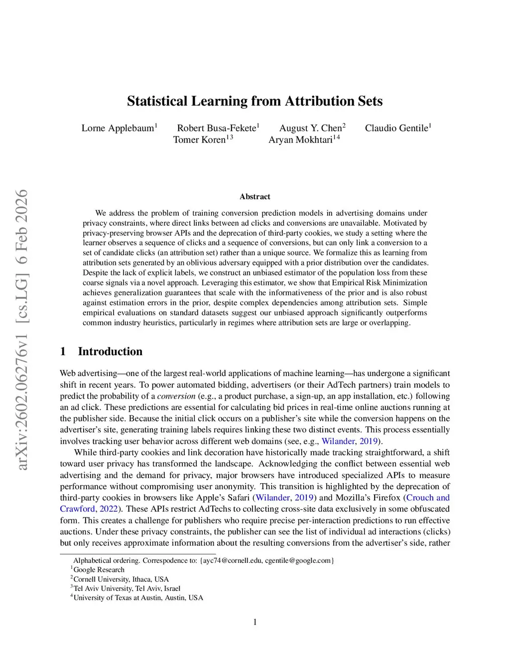 We address the problem of training conversion prediction models in advertising domains under privacy constraints, where direct links between ad clicks and conversions are unavailable. Motivated by privacy-preserving browser APIs and the deprecation of third-party cookies, we study a setting where the learner observes a sequence of clicks and a sequence of conversions, but can only link a conversion to a set of candidate clicks (an attribution set) rather than a unique source. We formalize this as learning from attribution sets generated by an oblivious adversary equipped with a prior distribution over the candidates. Despite the lack of explicit labels, we construct an unbiased estimator of the population loss from these coarse signals via a novel approach. Leveraging this estimator, we show that Empirical Risk Minimization achieves generalization guarantees that scale with the informativeness of the prior and is also robust against estimation errors in the prior, despite complex dependencies among attribution sets. Simple empirical evaluations on standard datasets suggest our unbiased approach significantly outperforms common industry heuristics, particularly in regimes where attribution sets are large or overlapping.