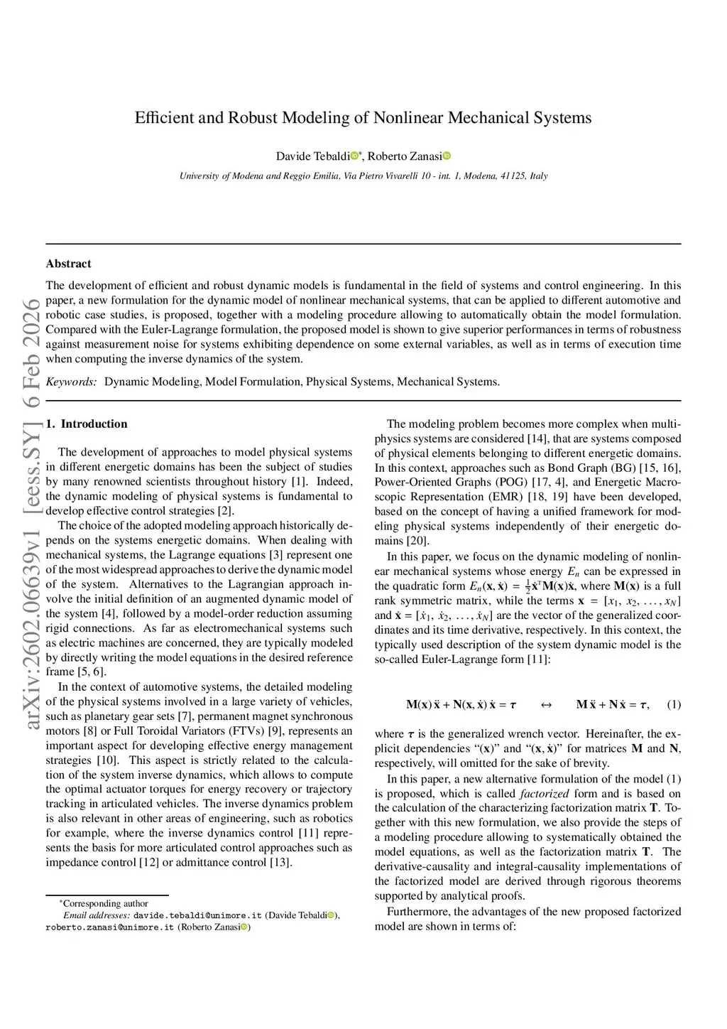 The development of efficient and robust dynamic models is fundamental in the field of systems and control engineering. In this paper, a new formulation for the dynamic model of nonlinear mechanical systems, that can be applied to different automotive and robotic case studies, is proposed, together with a modeling procedure allowing to automatically obtain the model formulation. Compared with the Euler-Lagrange formulation, the proposed model is shown to give superior performances in terms of robustness against measurement noise for systems exhibiting dependence on some external variables, as well as in terms of execution time when computing the inverse dynamics of the system.