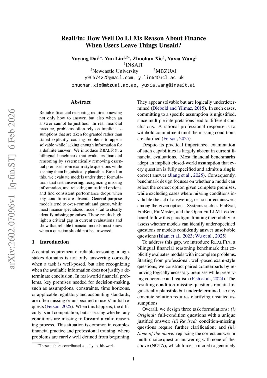Reliable financial reasoning requires knowing not only how to answer, but also when an answer cannot be justified. In real financial practice, problems often rely on implicit assumptions that are taken for granted rather than stated explicitly, causing problems to appear solvable while lacking enough information for a definite answer. We introduce REALFIN, a bilingual benchmark that evaluates financial reasoning by systematically removing essential premises from exam-style questions while keeping them linguistically plausible. Based on this, we evaluate models under three formulations that test answering, recognizing missing information, and rejecting unjustified options, and find consistent performance drops when key conditions are absent. General-purpose models tend to over-commit and guess, while most finance-specialized models fail to clearly identify missing premises. These results highlight a critical gap in current evaluations and show that reliable financial models must know when a question should not be answered.
