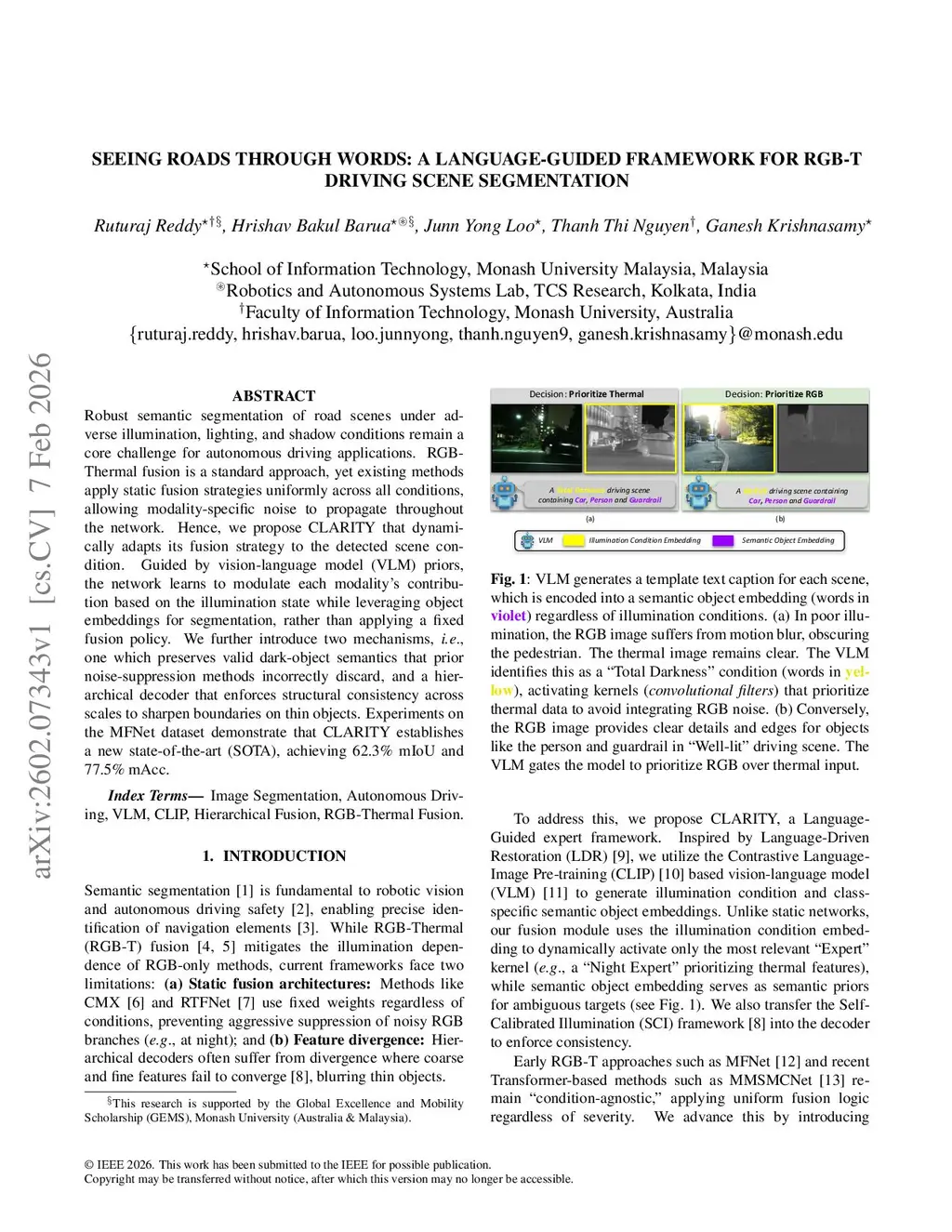 Robust semantic segmentation of road scenes under adverse illumination, lighting, and shadow conditions remain a core challenge for autonomous driving applications. RGB-Thermal fusion is a standard approach, yet existing methods apply static fusion strategies uniformly across all conditions, allowing modality-specific noise to propagate throughout the network. Hence, we propose CLARITY that dynamically adapts its fusion strategy to the detected scene condition. Guided by vision-language model (VLM) priors, the network learns to modulate each modality's contribution based on the illumination state while leveraging object embeddings for segmentation, rather than applying a fixed fusion policy. We further introduce two mechanisms, i.e., one which preserves valid dark-object semantics that prior noise-suppression methods incorrectly discard, and a hierarchical decoder that enforces structural consistency across scales to sharpen boundaries on thin objects. Experiments on the MFNet dataset demonstrate that CLARITY establishes a new state-of-the-art (SOTA), achieving 62.3% mIoU and 77.5% mAcc.
