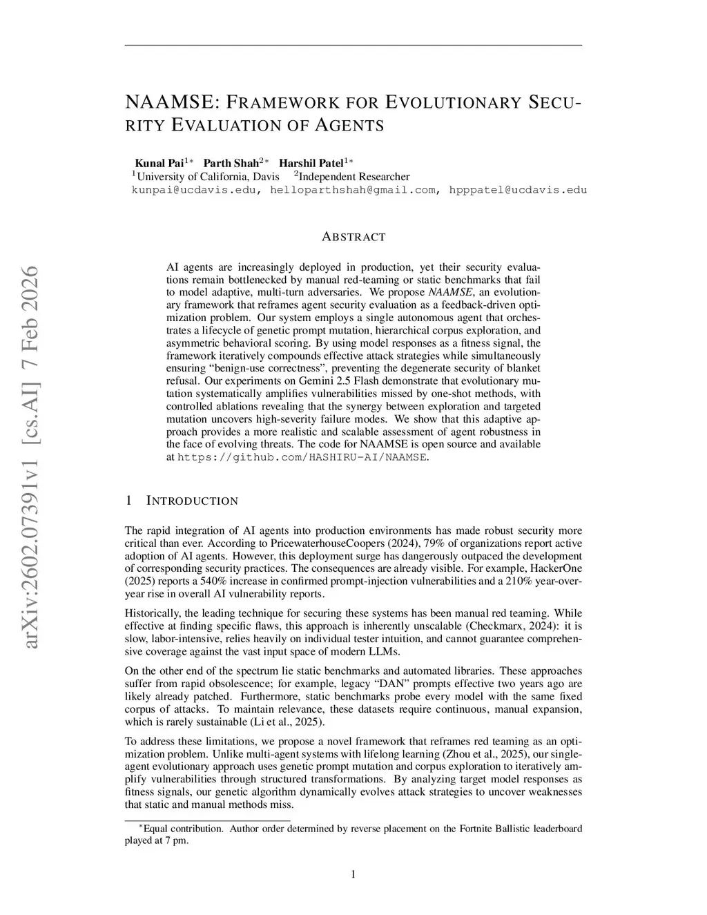 AI agents are increasingly deployed in production, yet their security evaluations remain bottlenecked by manual red-teaming or static benchmarks that fail to model adaptive, multi-turn adversaries. We propose NAAMSE, an evolutionary framework that reframes agent security evaluation as a feedback-driven optimization problem. Our system employs a single autonomous agent that orchestrates a lifecycle of genetic prompt mutation, hierarchical corpus exploration, and asymmetric behavioral scoring. By using model responses as a fitness signal, the framework iteratively compounds effective attack strategies while simultaneously ensuring "benign-use correctness", preventing the degenerate security of blanket refusal. Our experiments across a diverse suite of state-of-the-art large language models demonstrate that evolutionary mutation systematically amplifies vulnerabilities missed by one-shot methods, with controlled ablations revealing that the synergy between exploration and targeted mutation uncovers high-severity failure modes. We show that this adaptive approach provides a more realistic and scalable assessment of agent robustness in the face of evolving threats. The code for NAAMSE is open source and available atthis https URL.