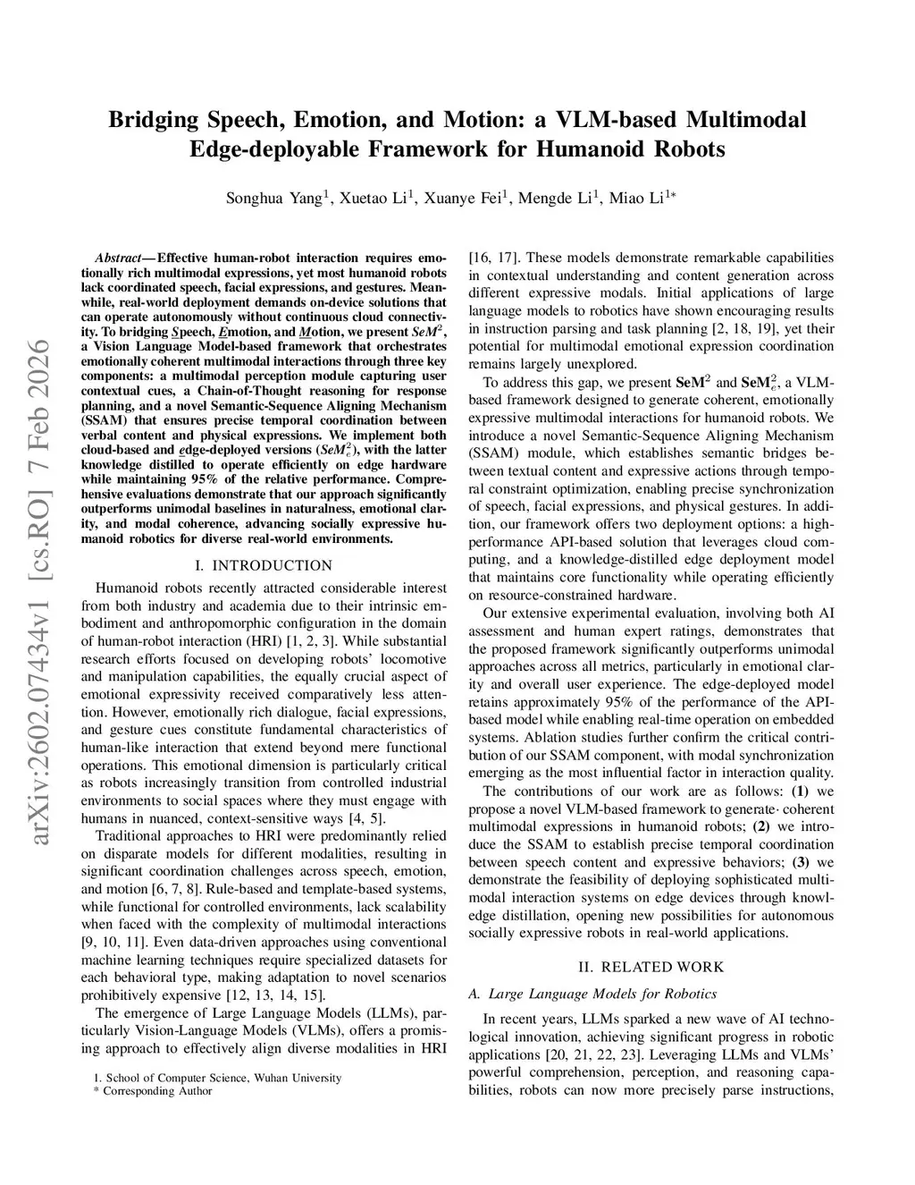 Effective human-robot interaction requires emotionally rich multimodal expressions, yet most humanoid robots lack coordinated speech, facial expressions, and gestures. Meanwhile, real-world deployment demands on-device solutions that can operate autonomously without continuous cloud connectivity. To bridging \underline{\textit{S}}peech, \underline{\textit{E}}motion, and \underline{\textit{M}}otion, we present \textit{SeM}, a Vision Language Model-based framework that orchestrates emotionally coherent multimodal interactions through three key components: a multimodal perception module capturing user contextual cues, a Chain-of-Thought reasoning for response planning, and a novel Semantic-Sequence Aligning Mechanism (SSAM) that ensures precise temporal coordination between verbal content and physical expressions. We implement both cloud-based and \underline{\textit{e}}dge-deployed versions (\textit{SeM}), with the latter knowledge distilled to operate efficiently on edge hardware while maintaining 95\% of the relative performance. Comprehensive evaluations demonstrate that our approach significantly outperforms unimodal baselines in naturalness, emotional clarity, and modal coherence, advancing socially expressive humanoid robotics for diverse real-world environments.