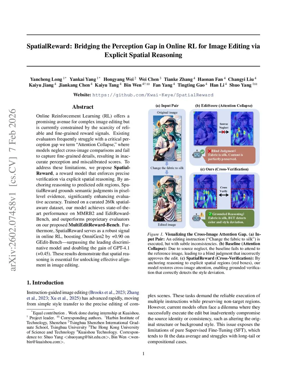Online Reinforcement Learning (RL) offers a promising avenue for complex image editing but is currently constrained by the scarcity of reliable and fine-grained reward signals. Existing evaluators frequently struggle with a critical perception gap we term "Attention Collapse," where models neglect cross-image comparisons and fail to capture fine-grained details, resulting in inaccurate perception and miscalibrated scores. To address these limitations, we propose SpatialReward, a reward model that enforces precise verification via explicit spatial reasoning. By anchoring reasoning to predicted edit regions, SpatialReward grounds semantic judgments in pixel-level evidence, significantly enhancing evaluative accuracy. Trained on a curated 260k spatial-aware dataset, our model achieves state-of-the-art performance on MMRB2 and EditReward-Bench, and outperforms proprietary evaluators on our proposed MultiEditReward-Bench. Furthermore, SpatialReward serves as a robust signal in online RL, boosting OmniGen2 by +0.90 on GEdit-Bench--surpassing the leading discriminative model and doubling the gain of GPT-4.1 (+0.45). These results demonstrate that spatial reasoning is essential for unlocking effective alignment in image editing.