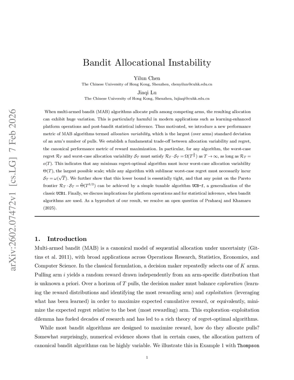 When multi-armed bandit (MAB) algorithms allocate pulls among competing arms, the resulting allocation can exhibit huge variation. This is particularly harmful in modern applications such as learning-enhanced platform operations and post-bandit statistical inference. Thus motivated, we introduce a new performance metric of MAB algorithms termed allocation variability, which is the largest (over arms) standard deviation of an arm's number of pulls. We establish a fundamental trade-off between allocation variability and regret, the canonical performance metric of reward maximization. In particular, for any algorithm, the worst-case regret and worst-case allocation variability must satisfy as , as long as . This indicates that any minimax regret-optimal algorithm must incur worst-case allocation variability , the largest possible scale; while any algorithm with sublinear worst-case regret must necessarily incur . We further show that this lower bound is essentially tight, and that any point on the Pareto frontier can be achieved by a simple tunable algorithm UCB-f, a generalization of the classic UCB1. Finally, we discuss implications for platform operations and for statistical inference, when bandit algorithms are used. As a byproduct of our result, we resolve an open question of Praharaj and Khamaru (2025).