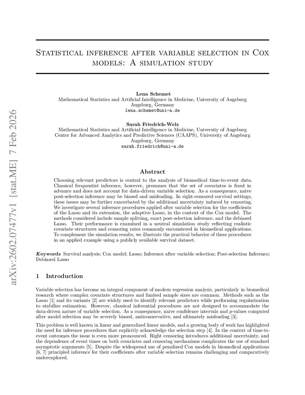 Choosing relevant predictors is central to the analysis of biomedical time-to-event data. Classical frequentist inference, however, presumes that the set of covariates is fixed in advance and does not account for data-driven variable selection. As a consequence, naive post-selection inference may be biased and misleading. In right-censored survival settings, these issues may be further exacerbated by the additional uncertainty induced by censoring. We investigate several inference procedures applied after variable selection for the coefficients of the Lasso and its extension, the adaptive Lasso, in the context of the Cox model. The methods considered include sample splitting, exact post-selection inference, and the debiased Lasso. Their performance is examined in a neutral simulation study reflecting realistic covariate structures and censoring rates commonly encountered in biomedical applications. To complement the simulation results, we illustrate the practical behavior of these procedures in an applied example using a publicly available survival dataset.