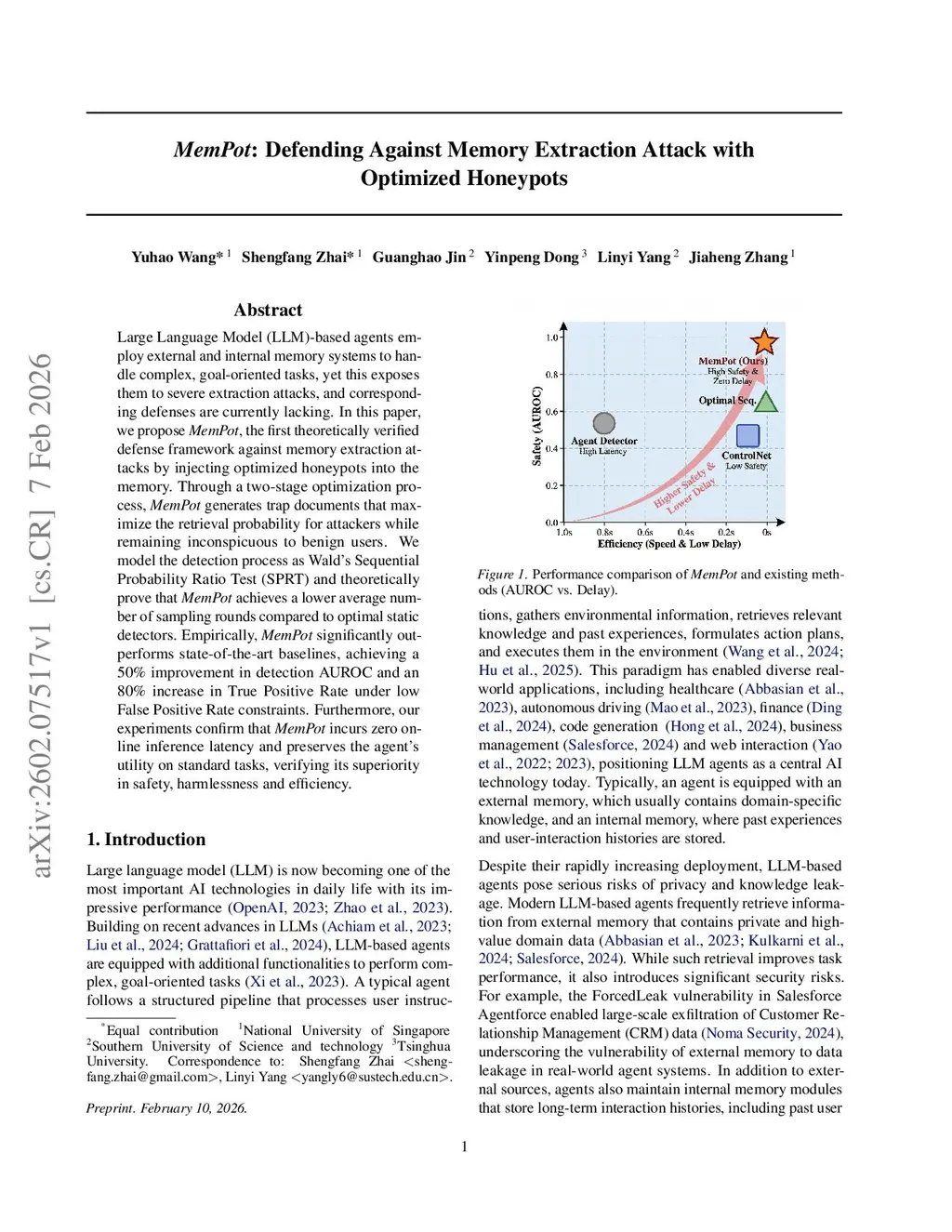 Large Language Model (LLM)-based agents employ external and internal memory systems to handle complex, goal-oriented tasks, yet this exposes them to severe extraction attacks, and effective defenses remain lacking. In this paper, we propose MemPot, the first theoretically verified defense framework against memory extraction attacks by injecting optimized honeypots into the memory. Through a two-stage optimization process, MemPot generates trap documents that maximize the retrieval probability for attackers while remaining inconspicuous to benign users. We model the detection process as Wald's Sequential Probability Ratio Test (SPRT) and theoretically prove that MemPot achieves a lower average number of sampling rounds compared to optimal static detectors. Empirically, MemPot significantly outperforms state-of-the-art baselines, achieving a 50% improvement in detection AUROC and an 80% increase in True Positive Rate under low False Positive Rate constraints. Furthermore, our experiments confirm that MemPot incurs zero additional online inference latency and preserves the agent's utility on standard tasks, verifying its superiority in safety, harmlessness, and efficiency.
