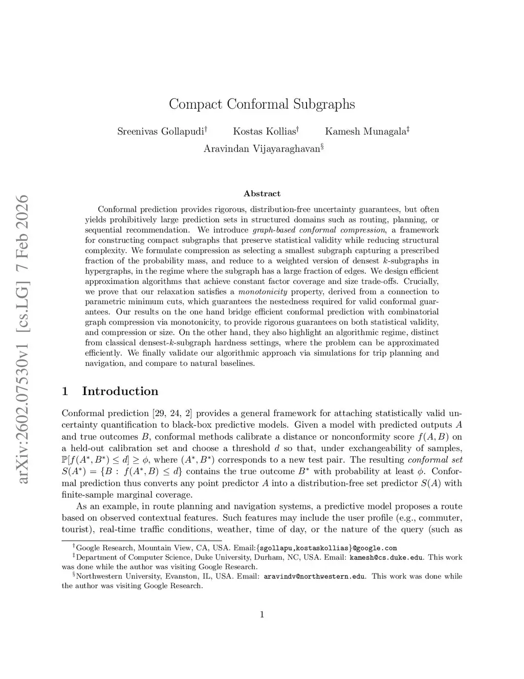 Conformal prediction provides rigorous, distribution-free uncertainty guarantees, but often yields prohibitively large prediction sets in structured domains such as routing, planning, or sequential recommendation. We introduce "graph-based conformal compression", a framework for constructing compact subgraphs that preserve statistical validity while reducing structural complexity. We formulate compression as selecting a smallest subgraph capturing a prescribed fraction of the probability mass, and reduce to a weighted version of densest -subgraphs in hypergraphs, in the regime where the subgraph has a large fraction of edges. We design efficient approximation algorithms that achieve constant factor coverage and size trade-offs. Crucially, we prove that our relaxation satisfies a monotonicity property, derived from a connection to parametric minimum cuts, which guarantees the nestedness required for valid conformal guarantees. Our results on the one hand bridge efficient conformal prediction with combinatorial graph compression via monotonicity, to provide rigorous guarantees on both statistical validity, and compression or size. On the other hand, they also highlight an algorithmic regime, distinct from classical densest--subgraph hardness settings, where the problem can be approximated efficiently. We finally validate our algorithmic approach via simulations for trip planning and navigation, and compare to natural baselines.