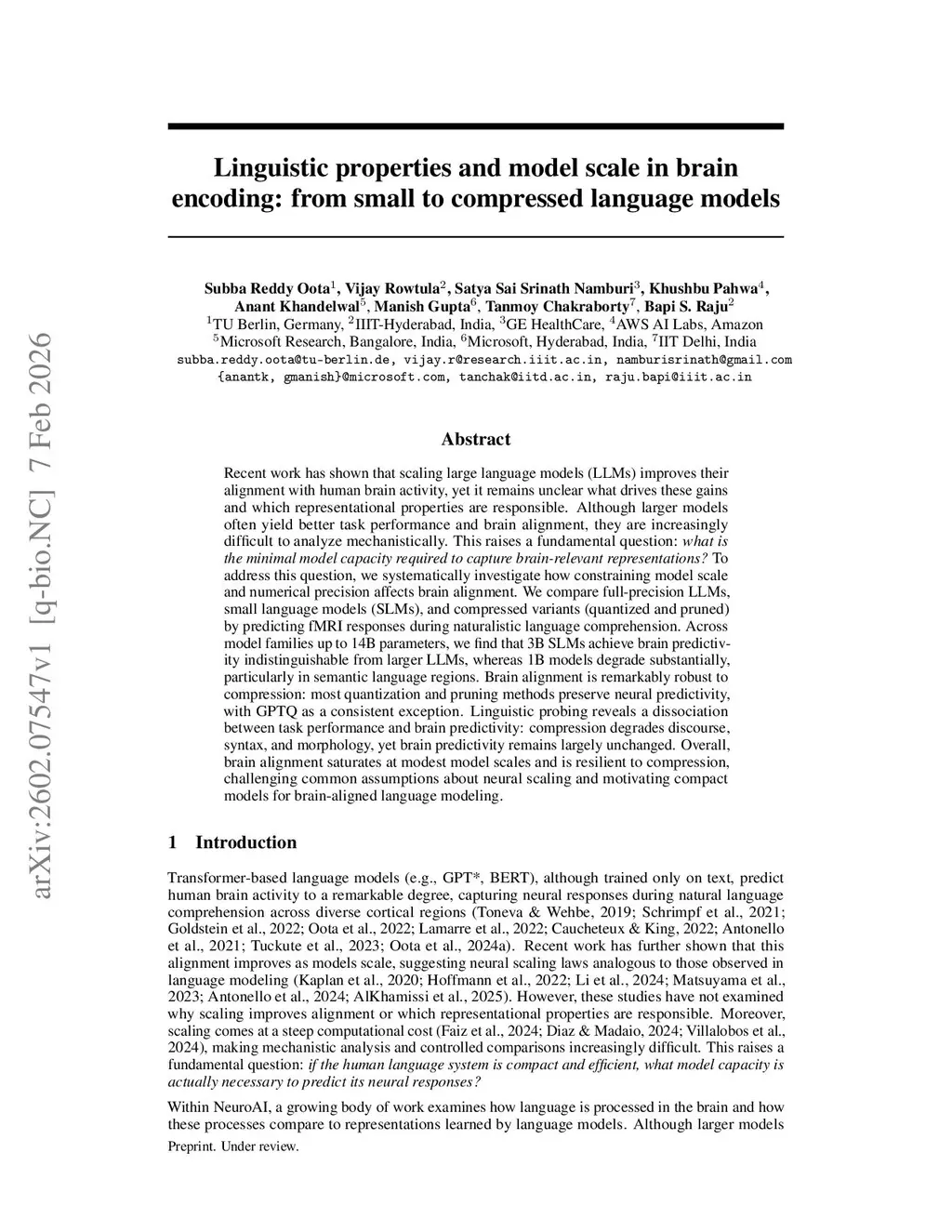 Recent work has shown that scaling large language models (LLMs) improves their alignment with human brain activity, yet it remains unclear what drives these gains and which representational properties are responsible. Although larger models often yield better task performance and brain alignment, they are increasingly difficult to analyze mechanistically. This raises a fundamental question: what is the minimal model capacity required to capture brain-relevant representations? To address this question, we systematically investigate how constraining model scale and numerical precision affects brain alignment. We compare full-precision LLMs, small language models (SLMs), and compressed variants (quantized and pruned) by predicting fMRI responses during naturalistic language comprehension. Across model families up to 14B parameters, we find that 3B SLMs achieve brain predictivity indistinguishable from larger LLMs, whereas 1B models degrade substantially, particularly in semantic language regions. Brain alignment is remarkably robust to compression: most quantization and pruning methods preserve neural predictivity, with GPTQ as a consistent exception. Linguistic probing reveals a dissociation between task performance and brain predictivity: compression degrades discourse, syntax, and morphology, yet brain predictivity remains largely unchanged. Overall, brain alignment saturates at modest model scales and is resilient to compression, challenging common assumptions about neural scaling and motivating compact models for brain-aligned language modeling.