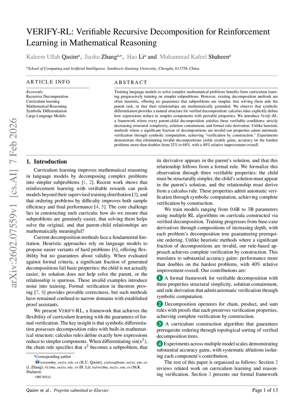 VERIFY-RL: Verifiable Recursive Decomposition for Reinforcement Learning in Mathematical Reasoning