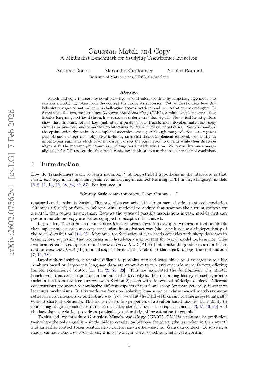 Match-and-copy is a core retrieval primitive used at inference time by large language models to retrieve a matching token from the context then copy its successor. Yet, understanding how this behavior emerges on natural data is challenging because retrieval and memorization are entangled. To disentangle the two, we introduce Gaussian Match-and-Copy (GMC), a minimalist benchmark that isolates long-range retrieval through pure second-order correlation signals. Numerical investigations show that this task retains key qualitative aspects of how Transformers develop match-and-copy circuits in practice, and separates architectures by their retrieval capabilities. We also analyze the optimization dynamics in a simplified attention setting. Although many solutions are a priori possible under a regression objective, including ones that do not implement retrieval, we identify an implicit-bias regime in which gradient descent drives the parameters to diverge while their direction aligns with the max-margin separator, yielding hard match selection. We prove this max-margin alignment for GD trajectories that reach vanishing empirical loss under explicit technical conditions.