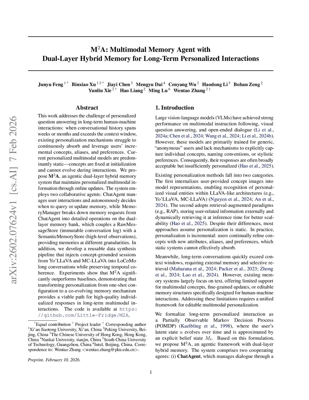 This work addresses the challenge of personalized question answering in long-term human-machine interactions: when conversational history spans weeks or months and exceeds the context window, existing personalization mechanisms struggle to continuously absorb and leverage users' incremental concepts, aliases, and preferences. Current personalized multimodal models are predominantly static-concepts are fixed at initialization and cannot evolve during interactions. We propose M2A, an agentic dual-layer hybrid memory system that maintains personalized multimodal information through online updates. The system employs two collaborative agents: ChatAgent manages user interactions and autonomously decides when to query or update memory, while MemoryManager breaks down memory requests from ChatAgent into detailed operations on the dual-layer memory bank, which couples a RawMessageStore (immutable conversation log) with a SemanticMemoryStore (high-level observations), providing memories at different granularities. In addition, we develop a reusable data synthesis pipeline that injects concept-grounded sessions from Yo'LLaVA and MC-LLaVA into LoCoMo long conversations while preserving temporal coherence. Experiments show that M2A significantly outperforms baselines, demonstrating that transforming personalization from one-shot configuration to a co-evolving memory mechanism provides a viable path for high-quality individualized responses in long-term multimodal interactions. The code is available atthis https URL.