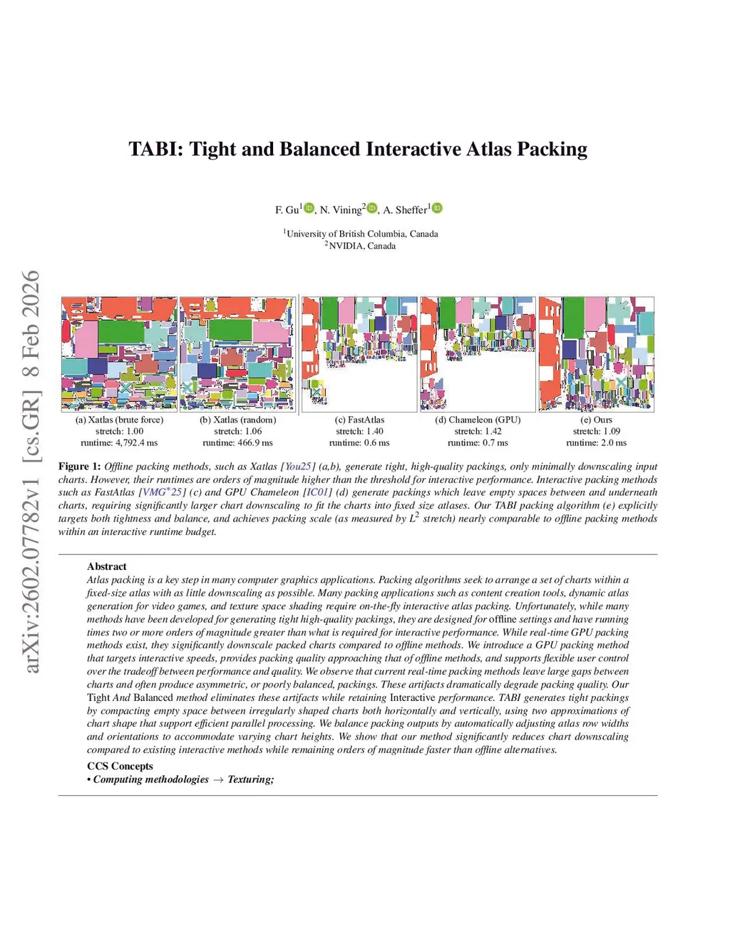 Atlas packing is a key step in many computer graphics applications. Packing algorithms seek to arrange a set of charts within a fixed-size atlas with as little downscaling as possible. Many packing applications such as content creation tools, dynamic atlas generation for video games, and texture space shading require on-the-fly interactive atlas packing. Unfortunately, while many methods have been developed for generating tight high-quality packings, they are designed for offline settings and have running times two or more orders of magnitude greater than what is required for interactive performance. While real-time GPU packing methods exist, they significantly downscale packed charts compared to offline methods. We introduce a GPU packing method that targets interactive speeds, provides packing quality approaching that of offline methods, and supports flexible user control over the tradeoff between performance and quality. We observe that current real-time packing methods leave large gaps between charts and often produce asymmetric, or poorly balanced, packings. These artifacts dramatically degrade packing quality. Our Tight And Balanced method eliminates these artifacts while retaining Interactive performance. TABI generates tight packings by compacting empty space between irregularly shaped charts both horizontally and vertically, using two approximations of chart shape that support efficient parallel processing. We balance packing outputs by automatically adjusting atlas row widths and orientations to accommodate varying chart heights. We show that our method significantly reduces chart downscaling compared to existing interactive methods while remaining orders of magnitude faster than offline alternatives.