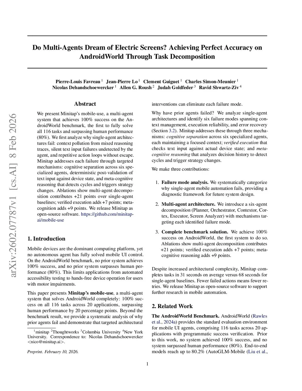 We present Minitap, a multi-agent system that achieves 100% success on the AndroidWorld benchmark, the first to fully solve all 116 tasks and surpassing human performance (80%). We first analyze why single-agent architectures fail: context pollution from mixed reasoning traces, silent text input failures undetected by the agent, and repetitive action loops without escape. Minitap addresses each failure through targeted mechanisms: cognitive separation across six specialized agents, deterministic post-validation of text input against device state, and meta-cognitive reasoning that detects cycles and triggers strategy changes. Ablations show multi-agent decomposition contributes +21 points over single-agent baselines; verified execution adds +7 points; meta-cognition adds +9 points. We release Minitap as open-source software.this https URL